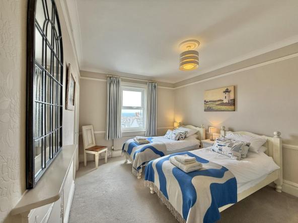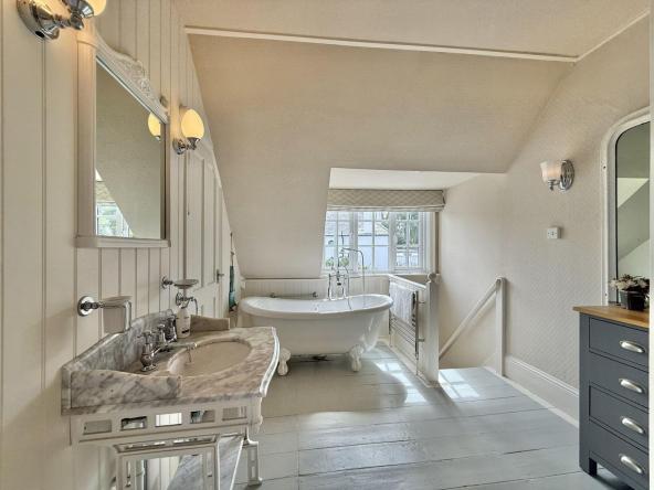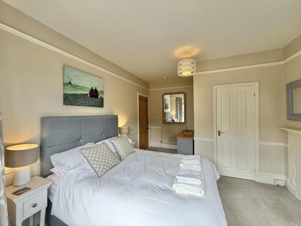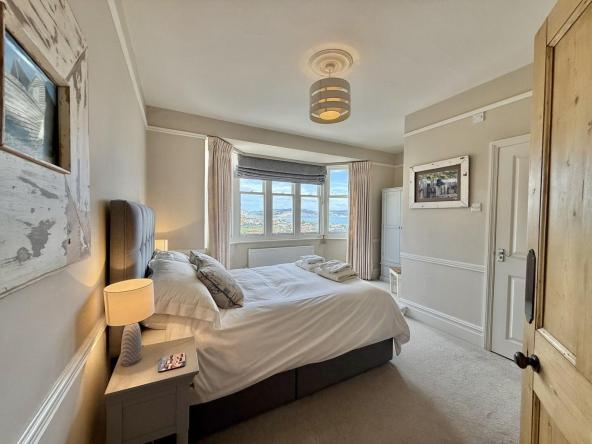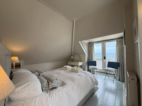 The spacious home has many original features which have been sympathetically restored but features all modern conveniences. There is a large kitchen dining area and a lounge with a cosy open fire which opens out onto a terraced seating area. The property sleeps up to 8 guests in 4 bedrooms which all have en-suite bathrooms. Three of the bedrooms have king-size beds and one bedroom is a twin room. The largest bedroom on the second floor also has its own balcony.