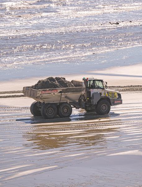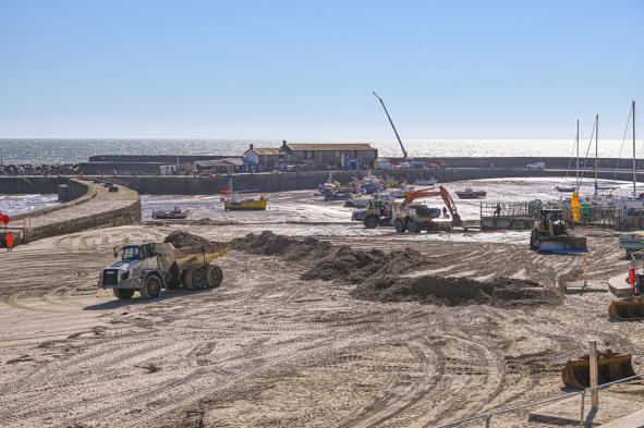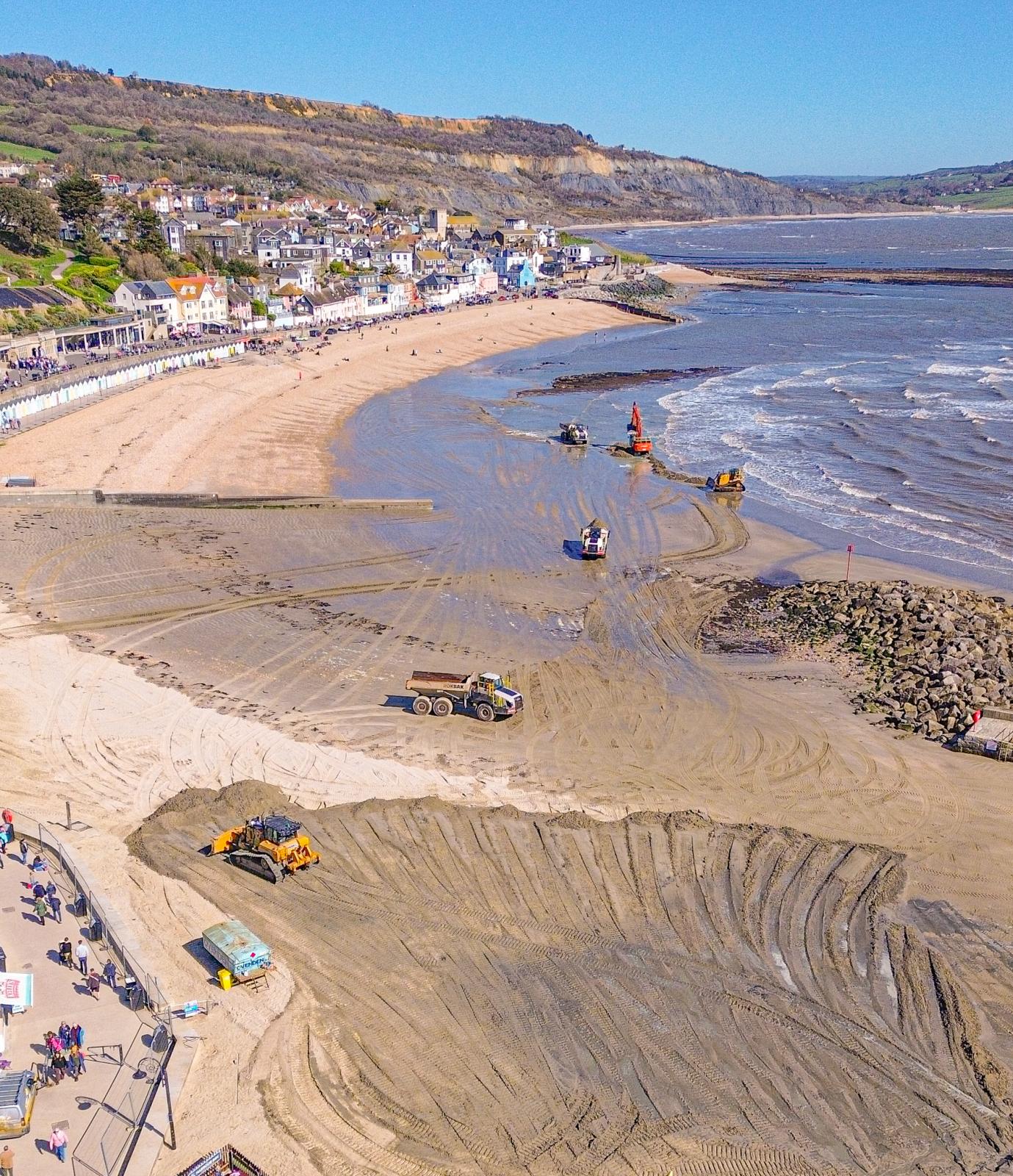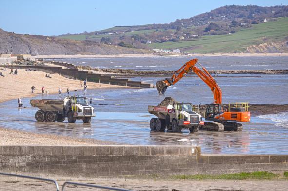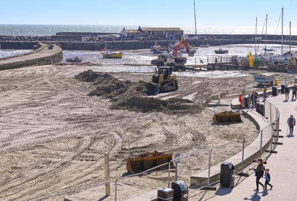 The annual reprofiling of the Sandy Beach began yesterday. Following the winter storms, tonnes of sand have been washed away. Dorset Council contractors are now using heavy machinery to recover sand from the shoreline and redistribute it back onto the beach.
