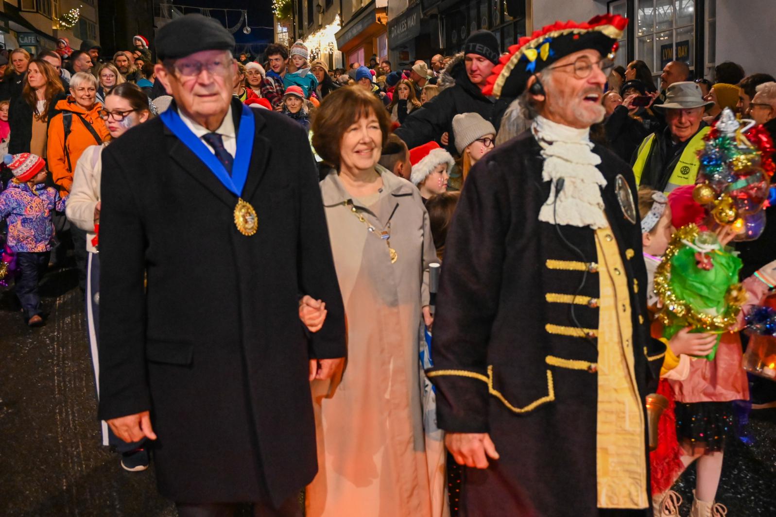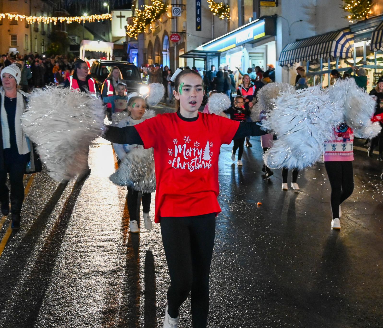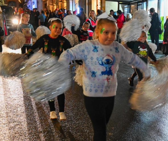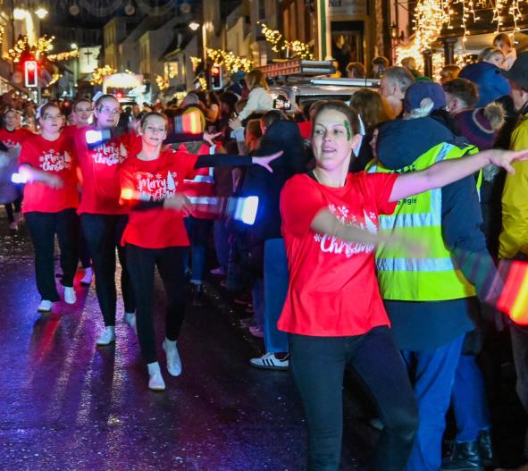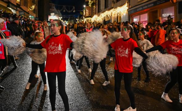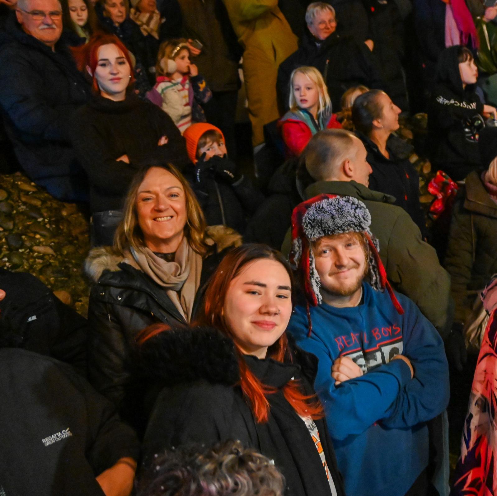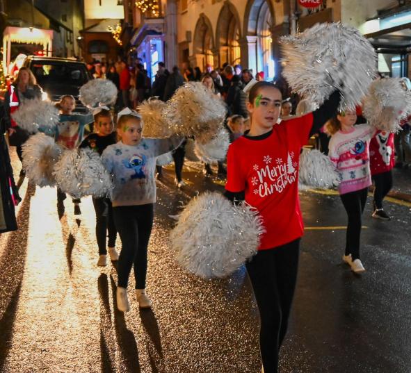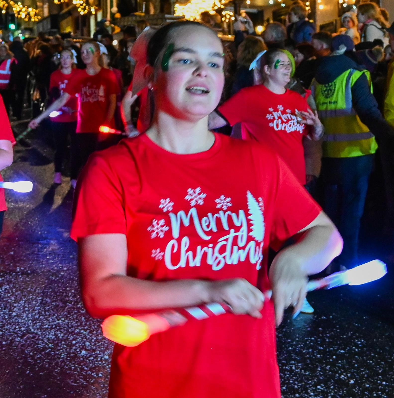 The rain eased just in time for celebrations as a huge crowd gathered on Broad Street on Saturday evening to witness the magical switching-on of the town’s Christmas lights.