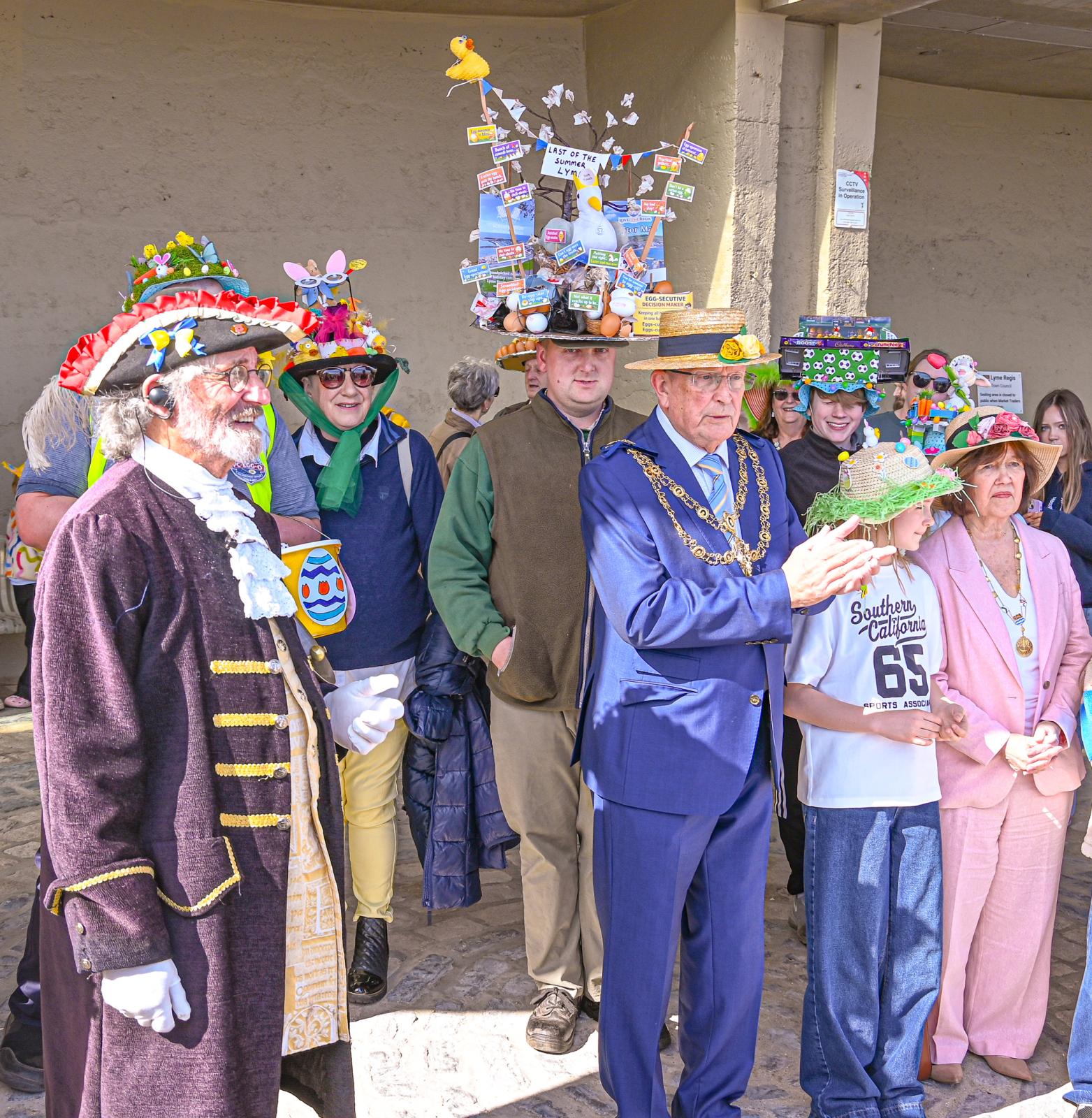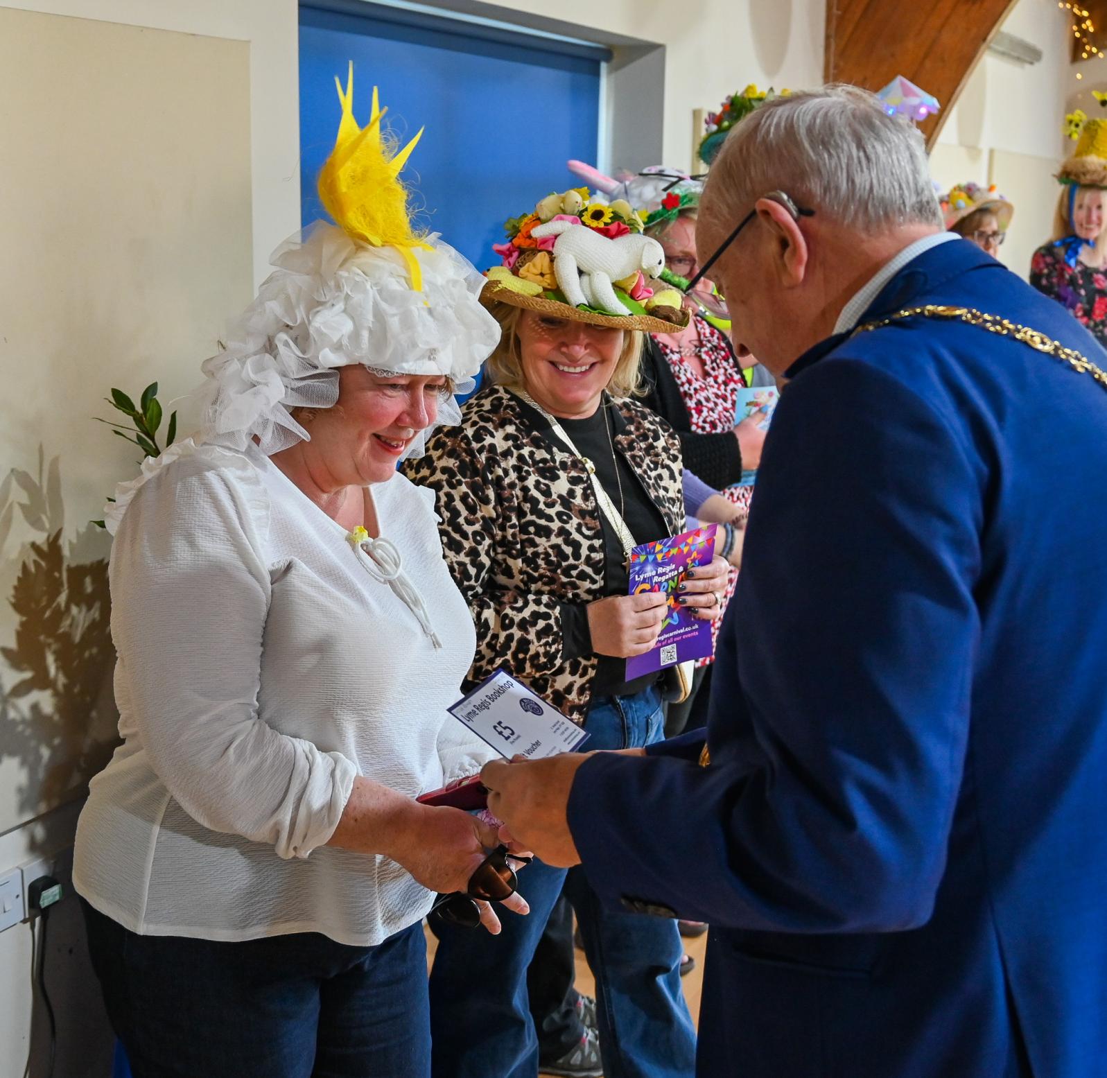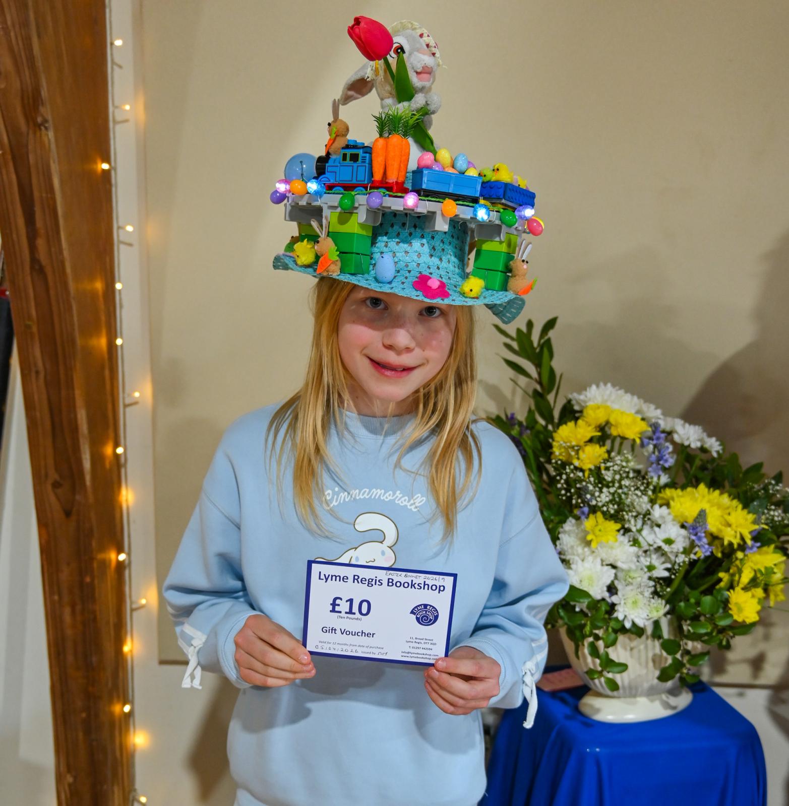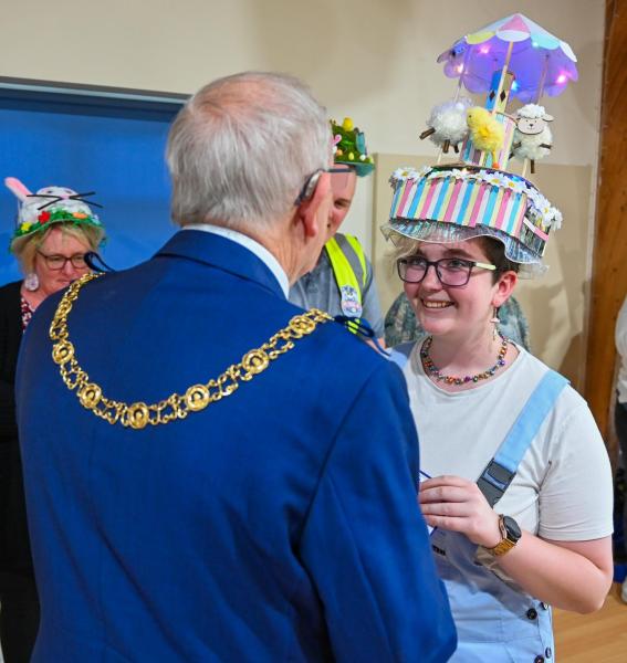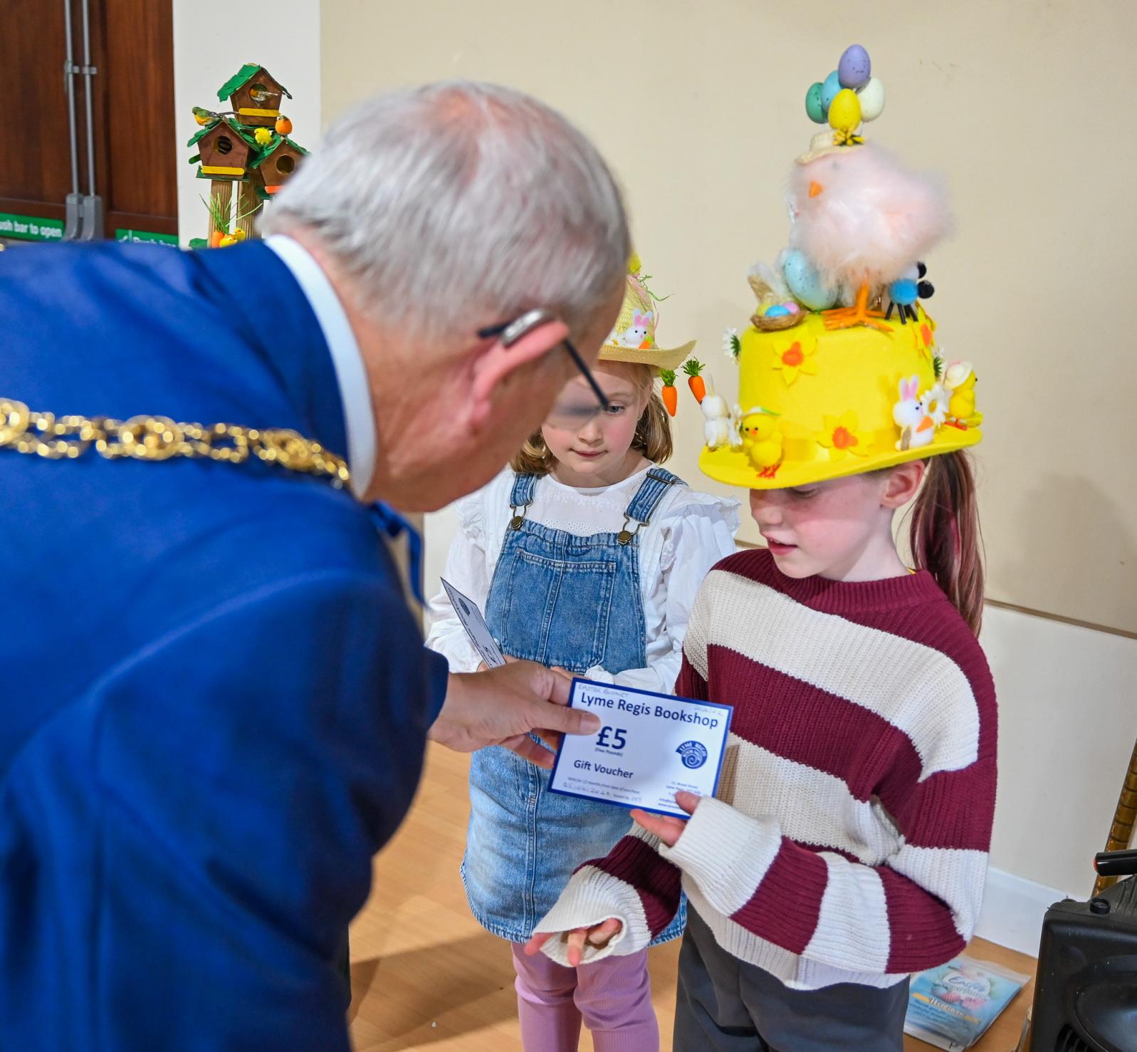 Ben Matthews of Dorset and Devon Holiday Cottages took on the challenging role of judge, carefully considering each bonnet and taking time to chat with participants. The standard was impressively high, with many imaginative designs on show. Vouchers kindly donated by Lyme Regis Bookshop, were presented as prizes by the Mayor of Lyme Regis, Cllr Philip Evans MBE. Each entrant received a consolation prize provided by Ben.