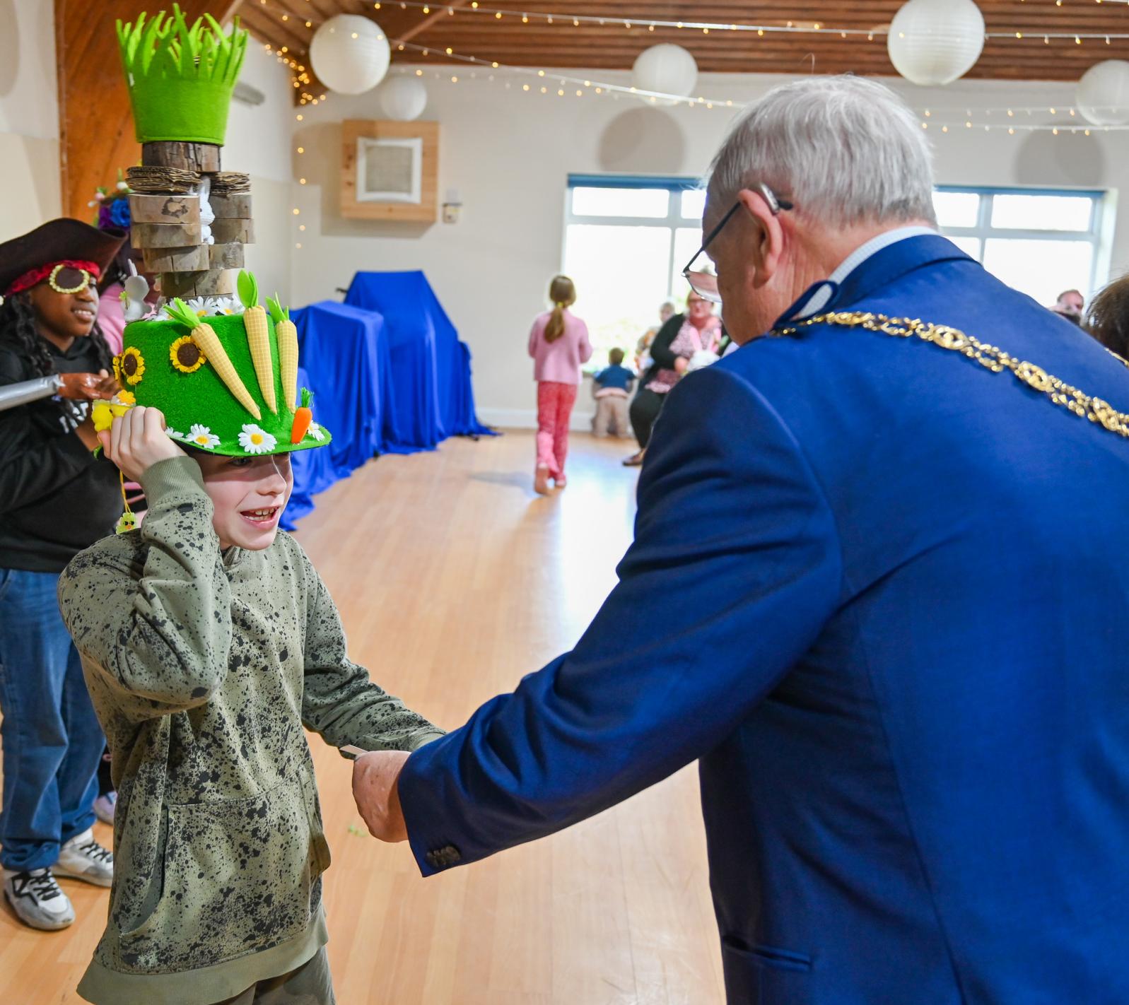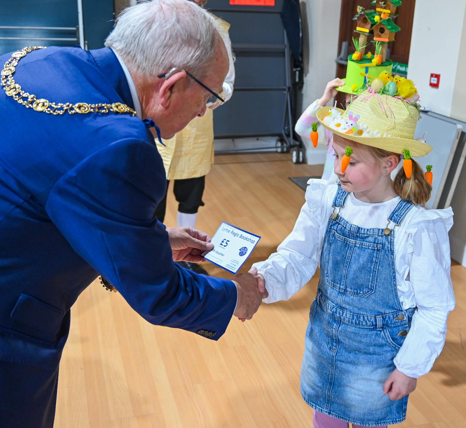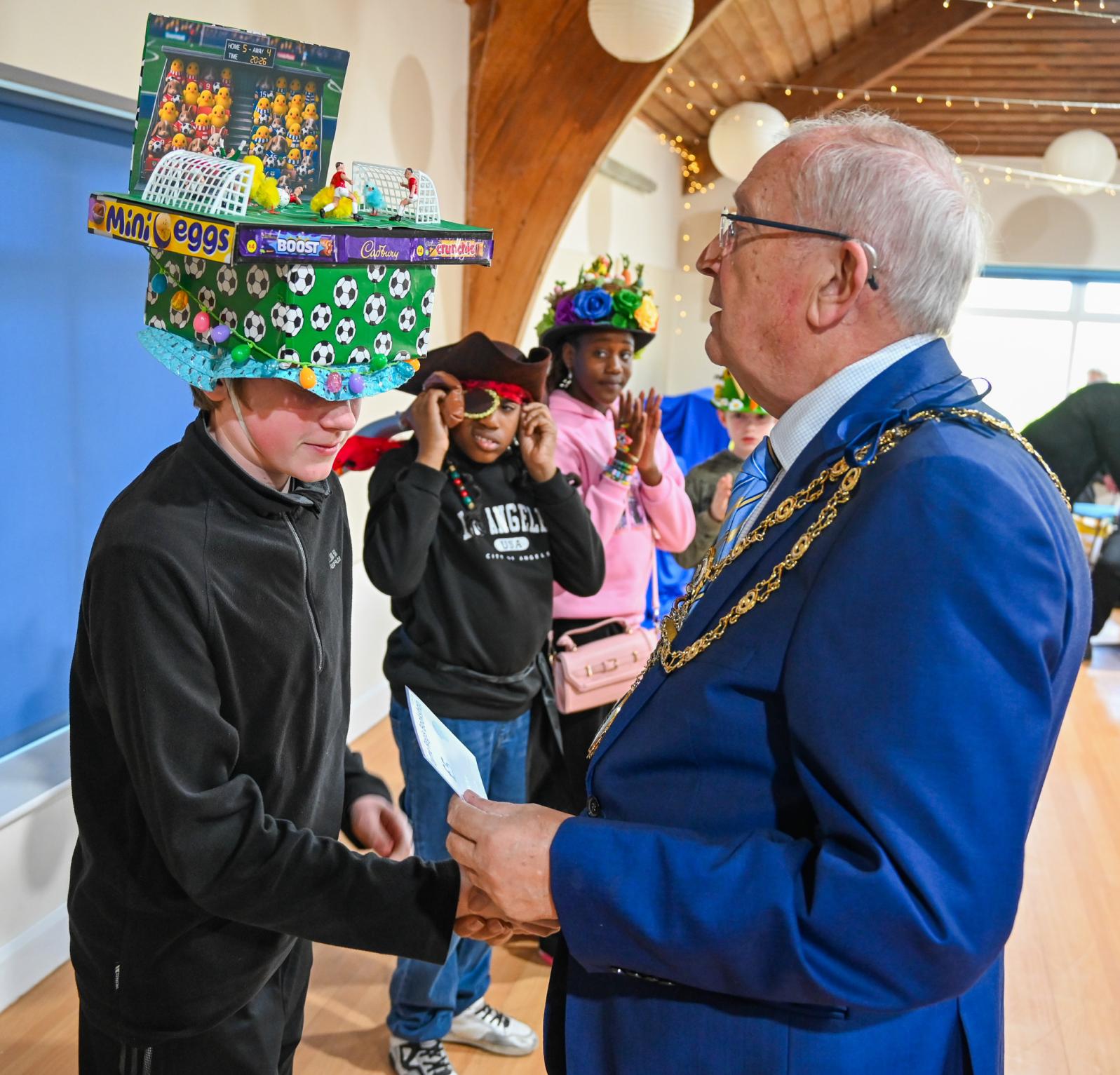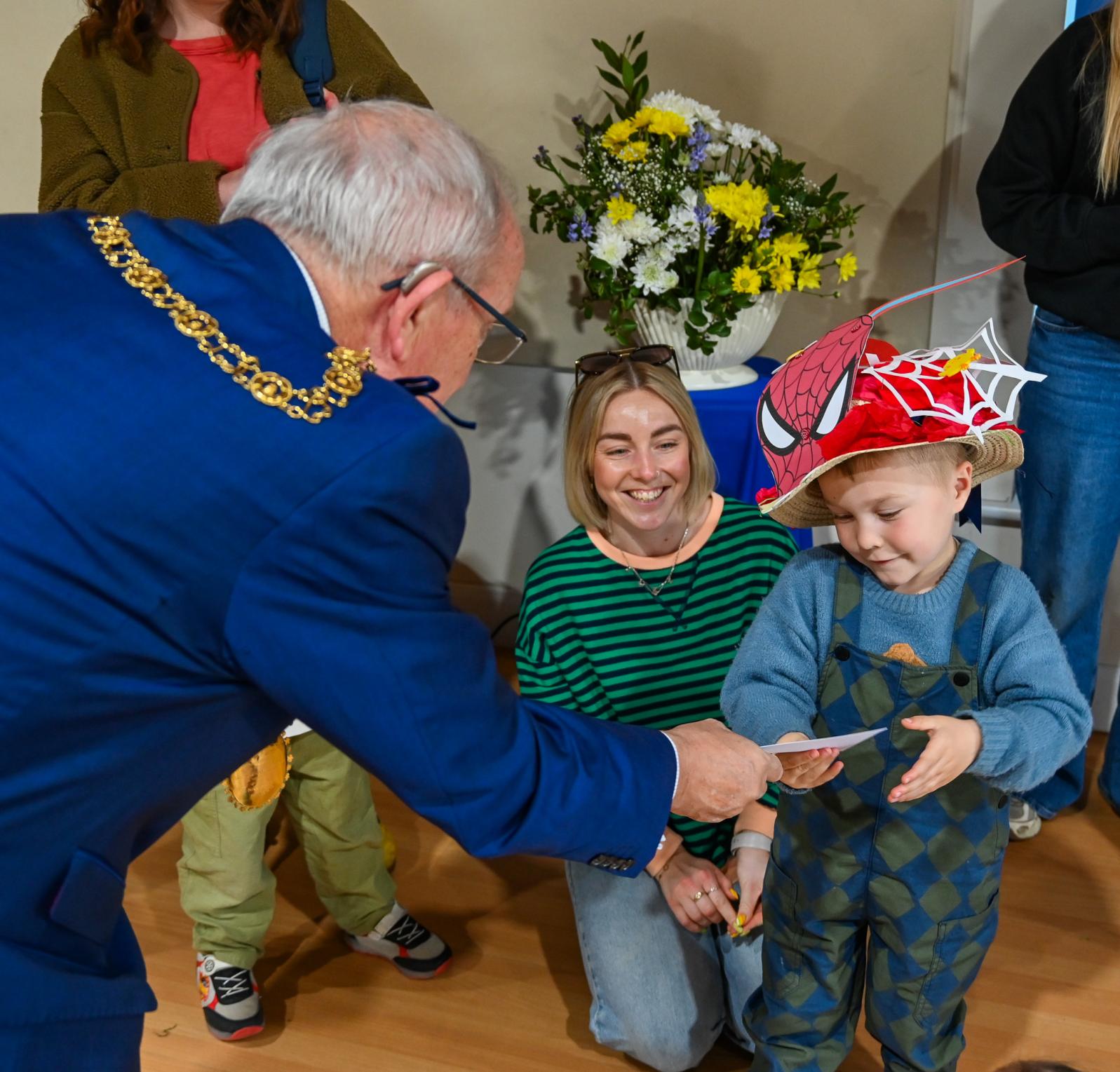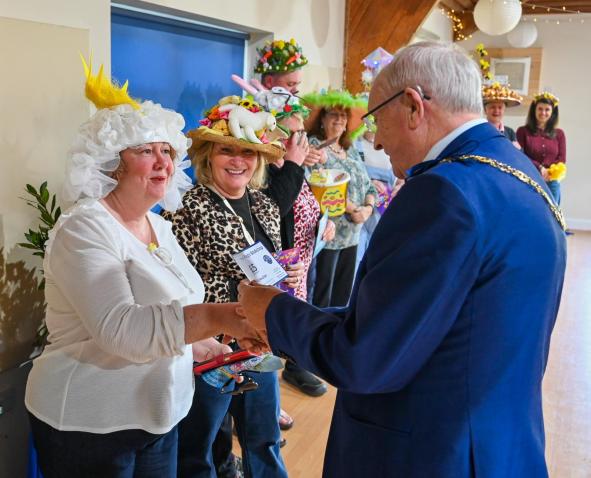 Ben Matthews of Dorset and Devon Holiday Cottages took on the challenging role of judge, carefully considering each bonnet and taking time to chat with participants. The standard was impressively high, with many imaginative designs on show. Vouchers kindly donated by Lyme Regis Bookshop, were presented as prizes by the Mayor of Lyme Regis, Cllr Philip Evans MBE. Each entrant received a consolation prize provided by Ben.