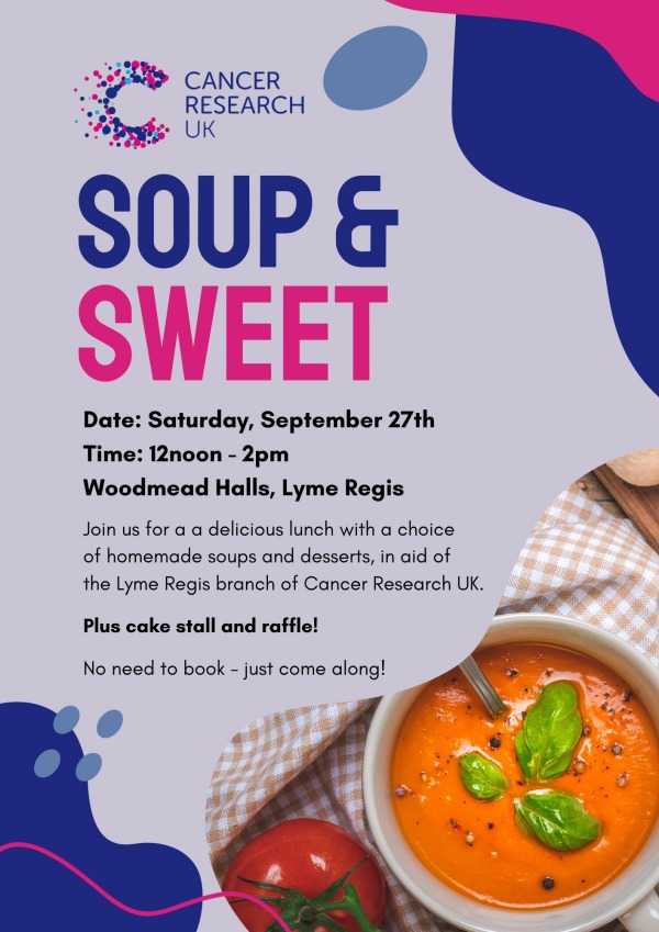 The next fundraising event for Cancer Research UK will be a soup and sweet lunch on Saturday 27th September taking place from midday until 2pm at the Woodmead Halls in Lyme Regis. Come along for a delicious lunch with a choice of homemade soup and bread and a selection of desserts and help raise funds for a great cause.