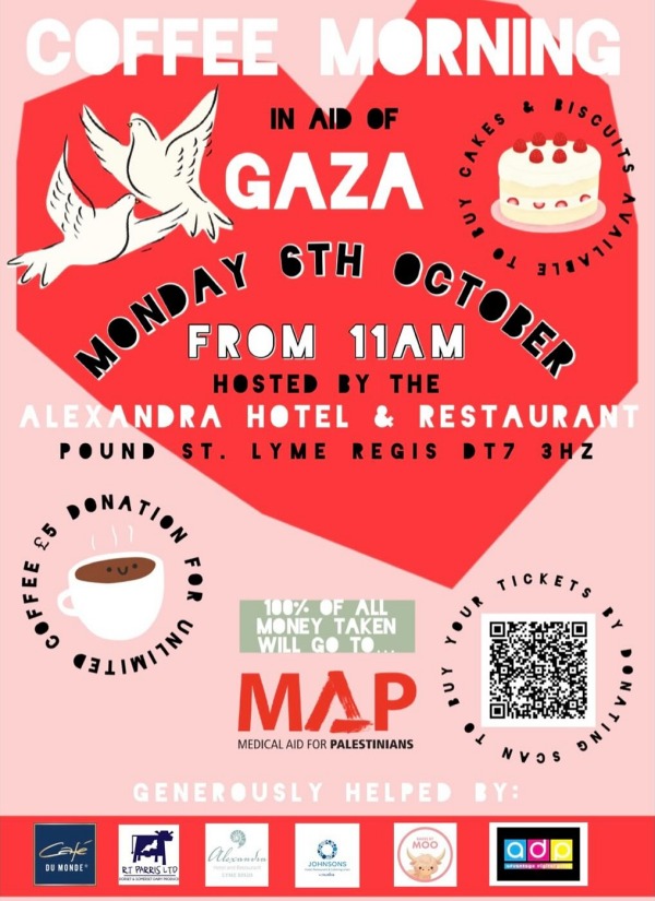 On Monday 6 October, the Alexandra Hotel will be holding a coffee morning fundraiser in aid of MAP (Medical Aid for Palestinians) and their amazing operation to help the Palestinians during the horrific current events in GAZA.