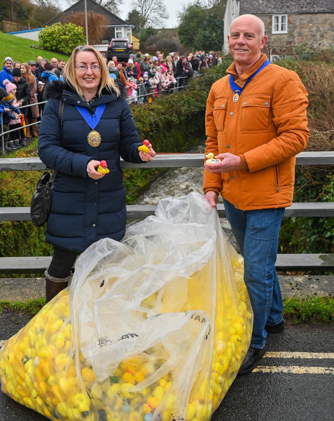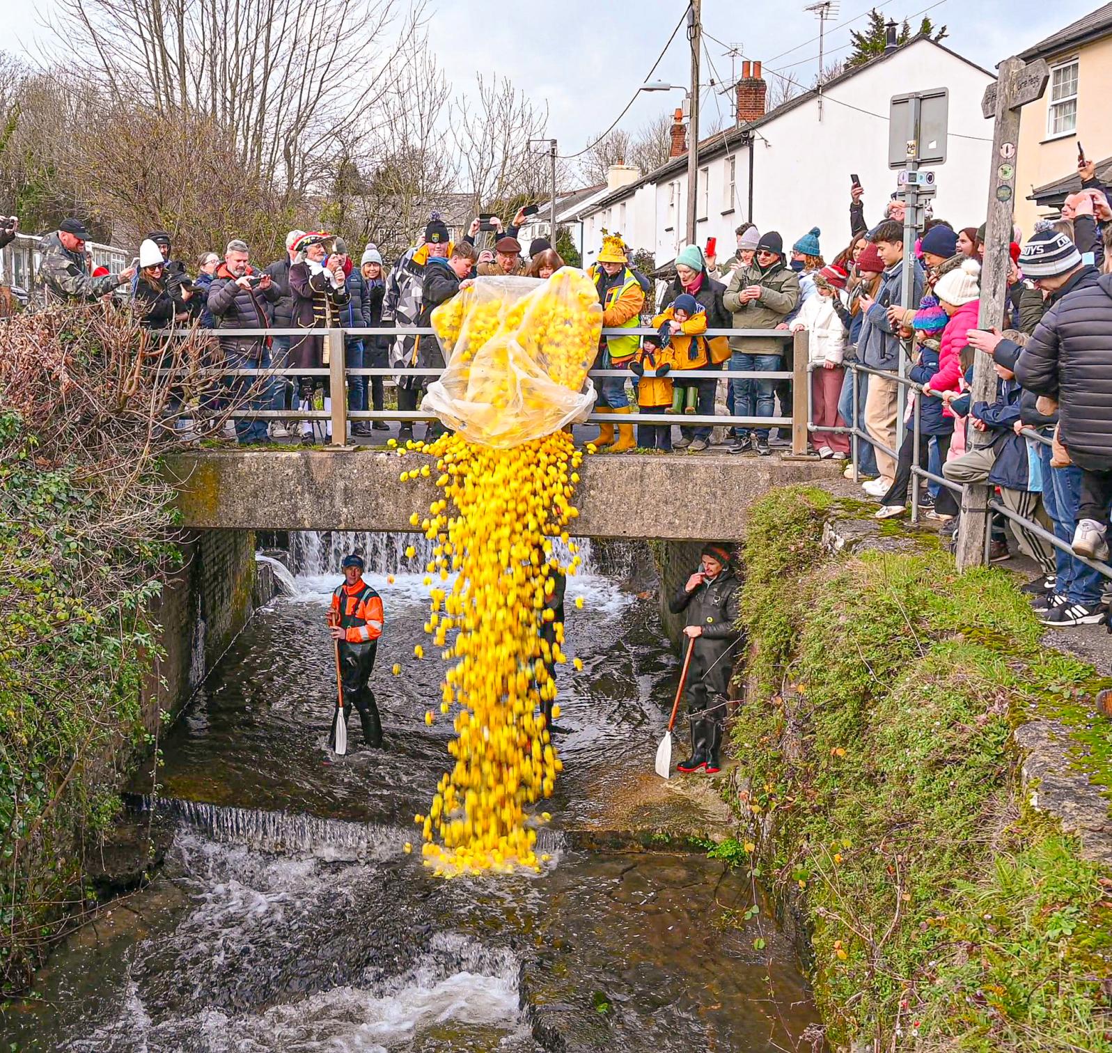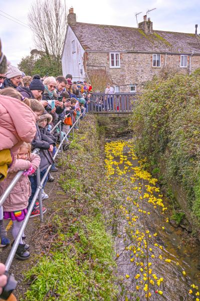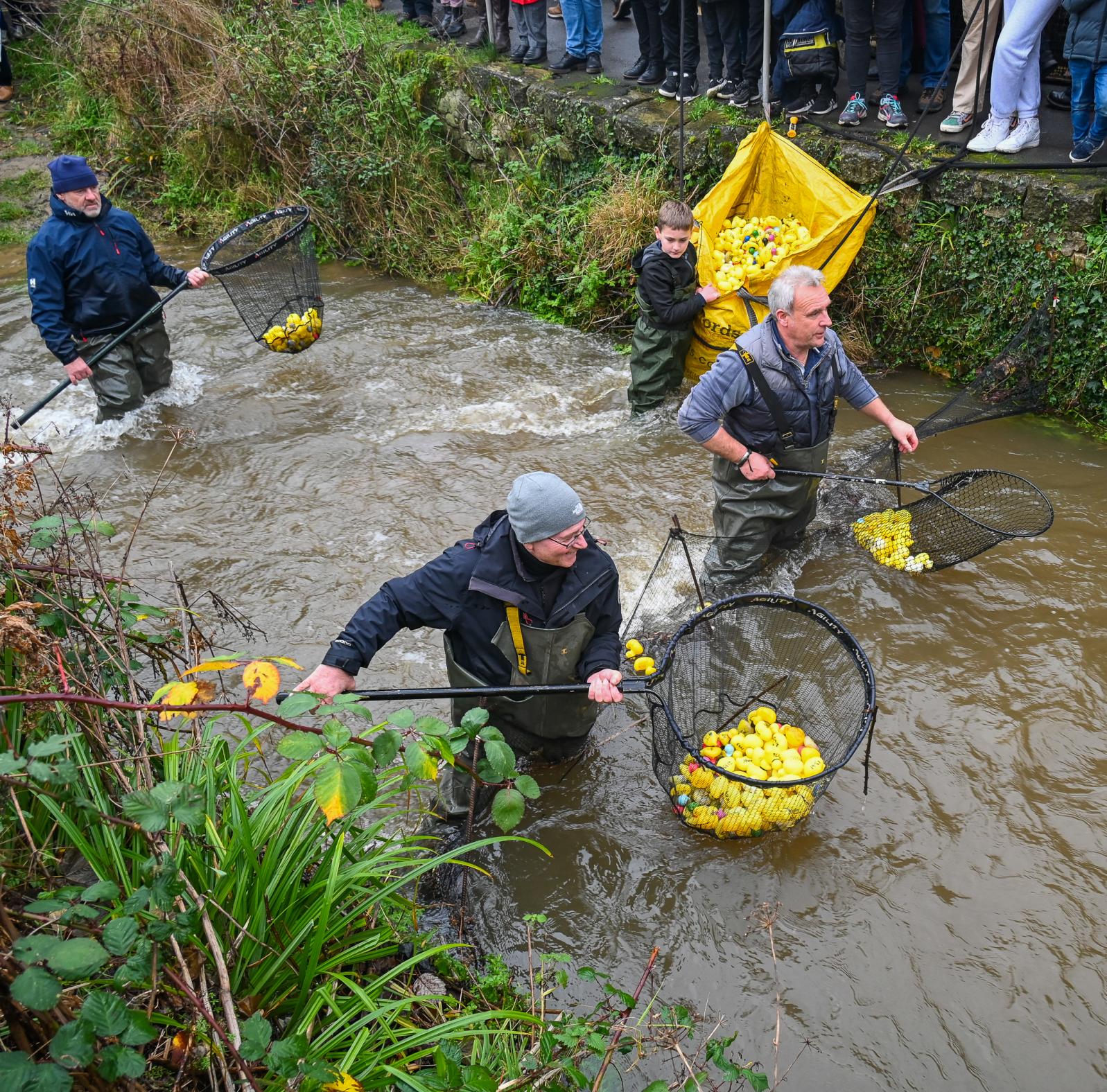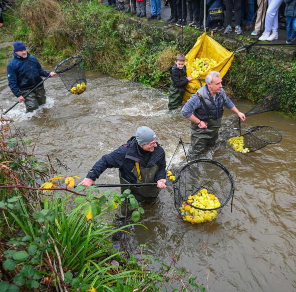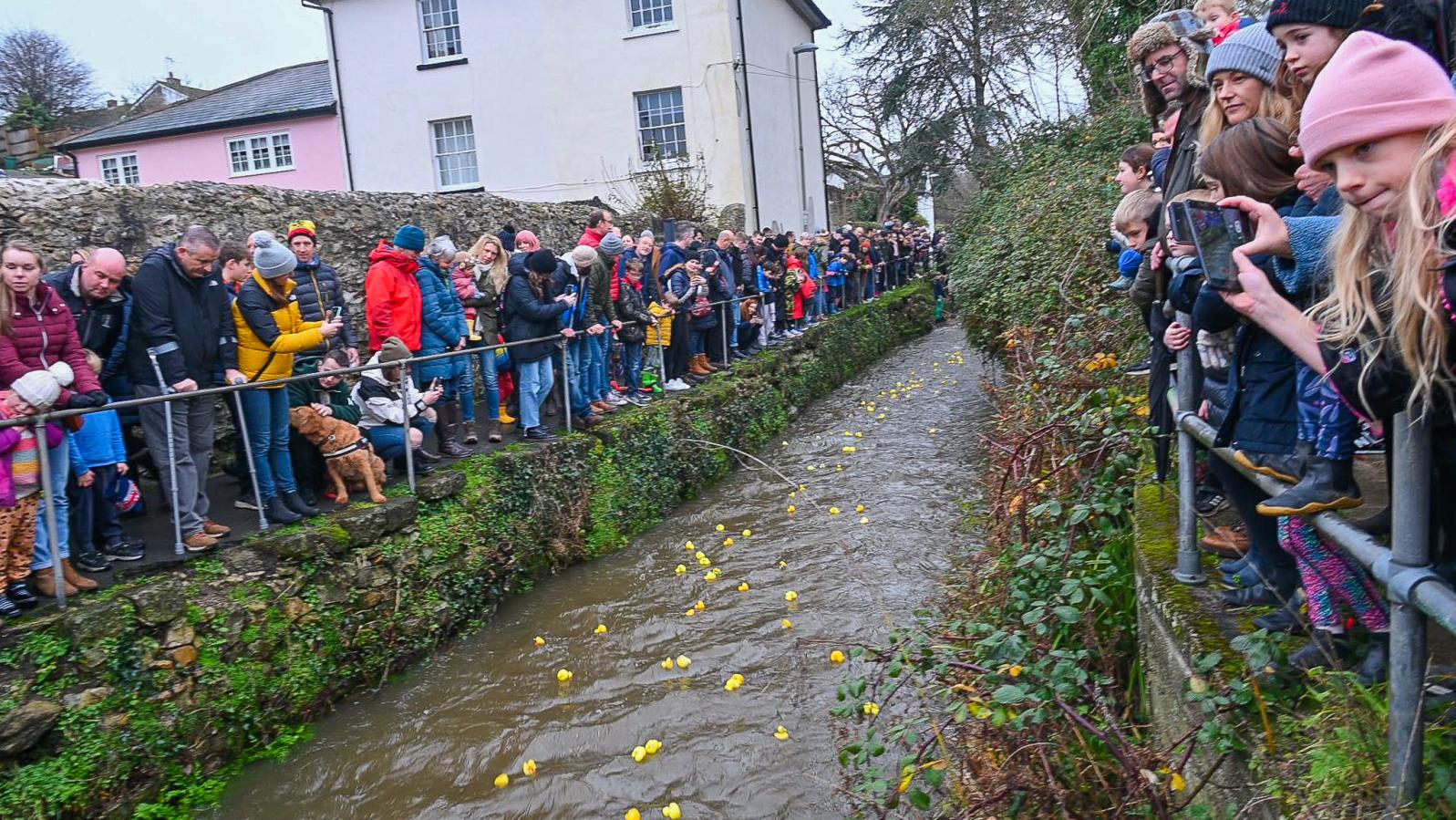 Everyone goes a bit quackers at midday on New Year’s Day as hundreds of individually numbered bright yellow toy ducks are released into the River Lym at Woodmead Road bridge where they hurtle downstream in a mad paddle towards the finish line at Jordan Flats.