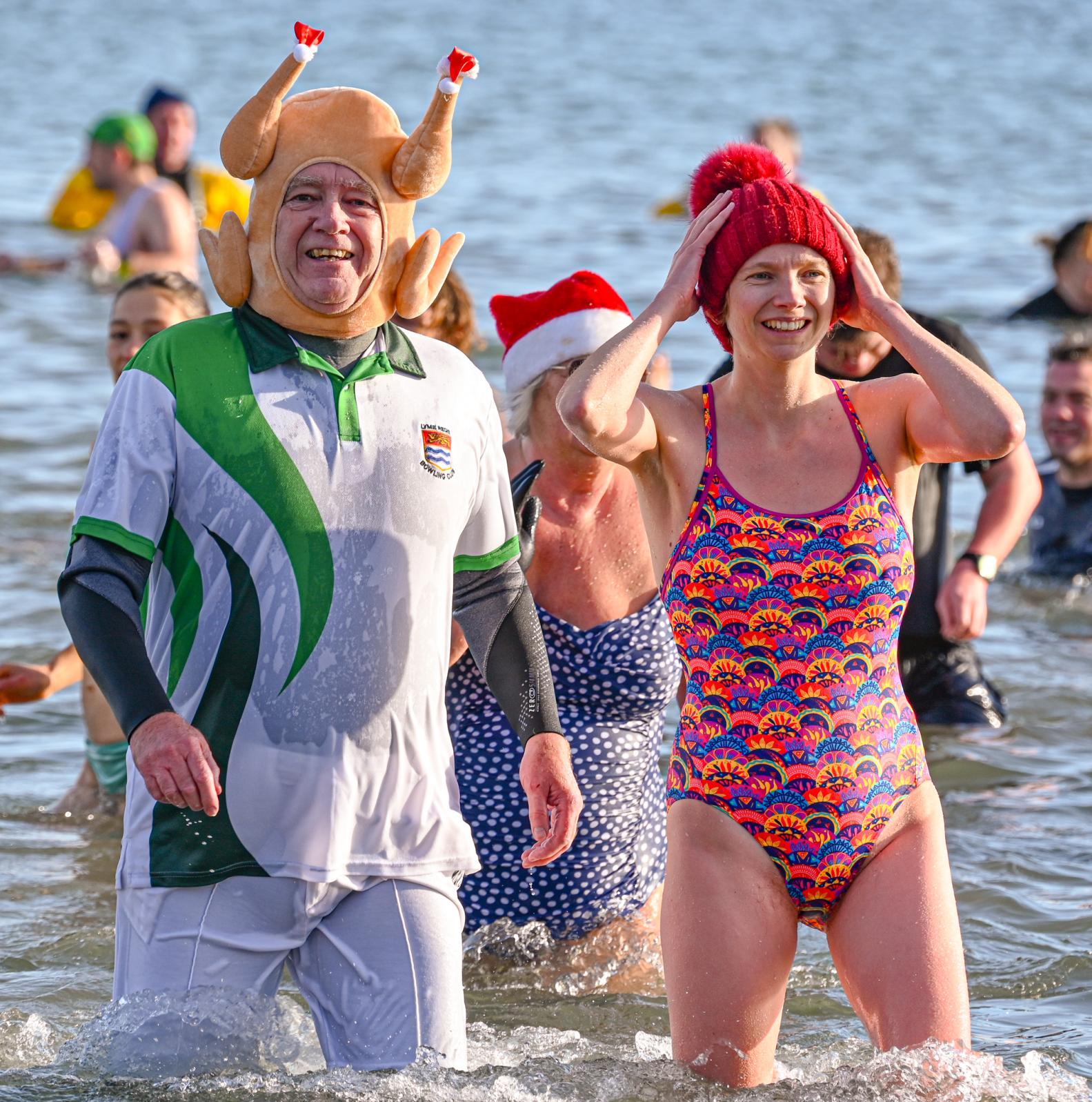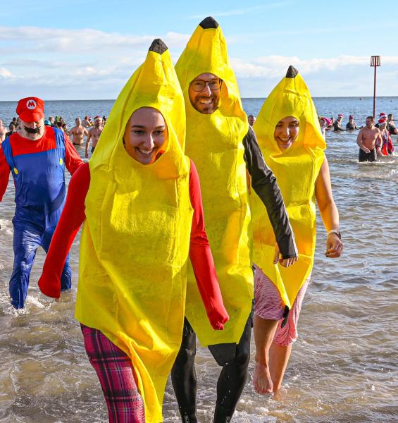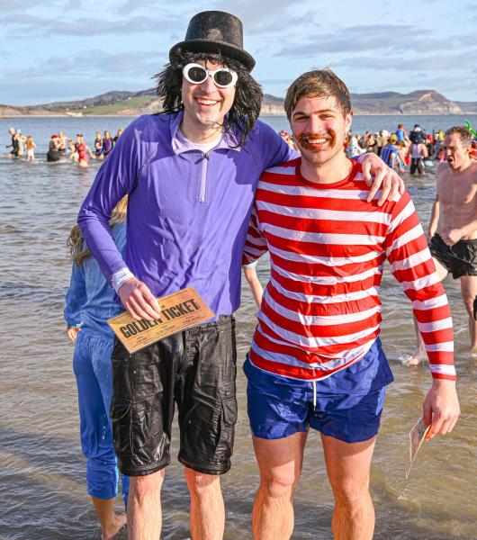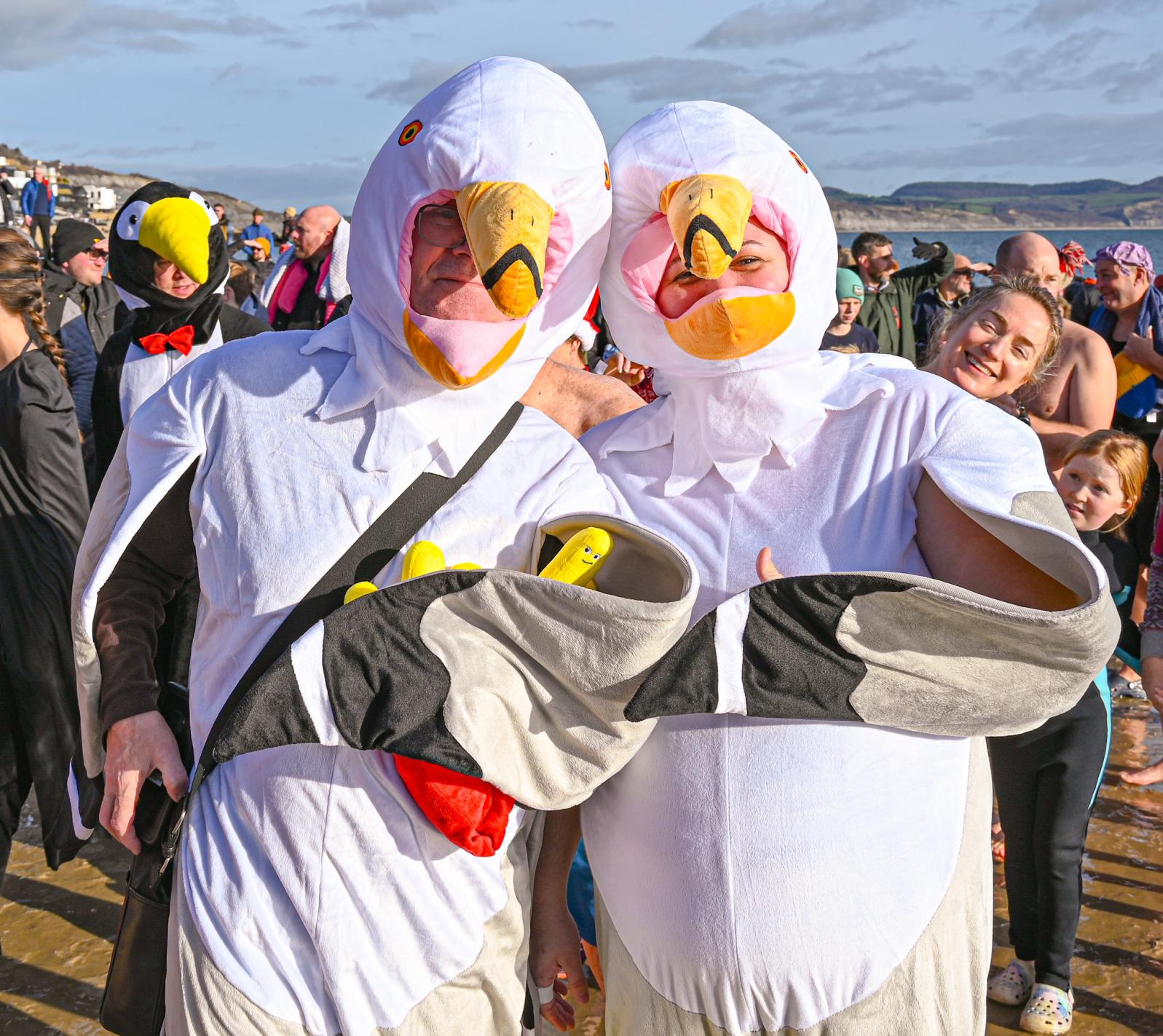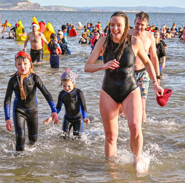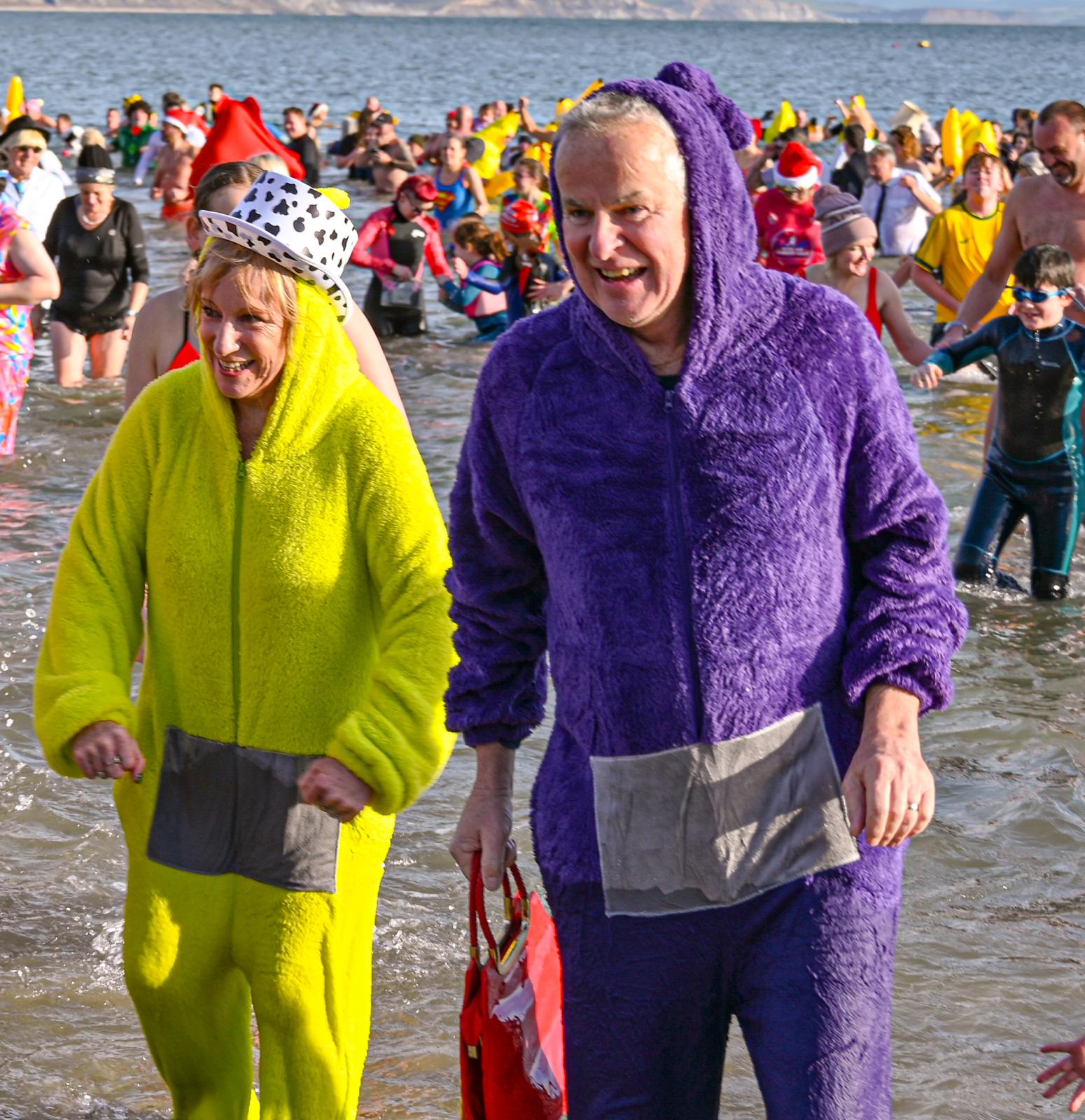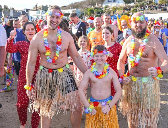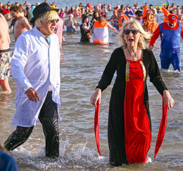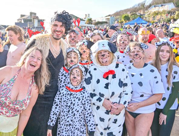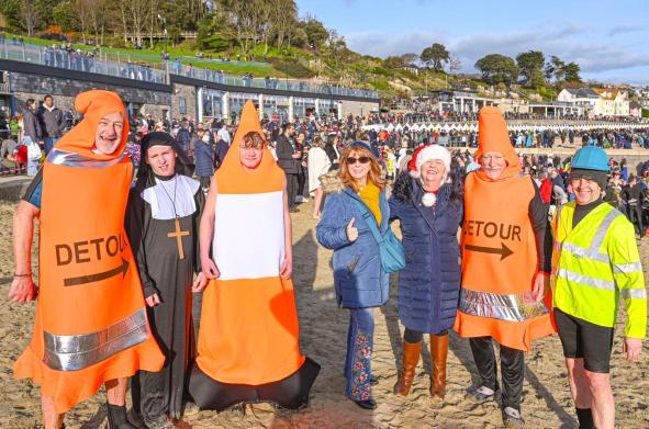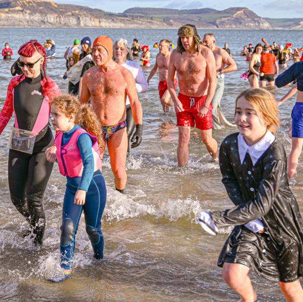 Around 1,500 hardy participants braved the chilly waters for the Lyme Lunge today, the New Year’s Day fancy dress sea dip organised by the Rotary Club of Lyme Regis. Thousands of spectators lined the seafront and filled the gardens to enjoy the colourful spectacle.