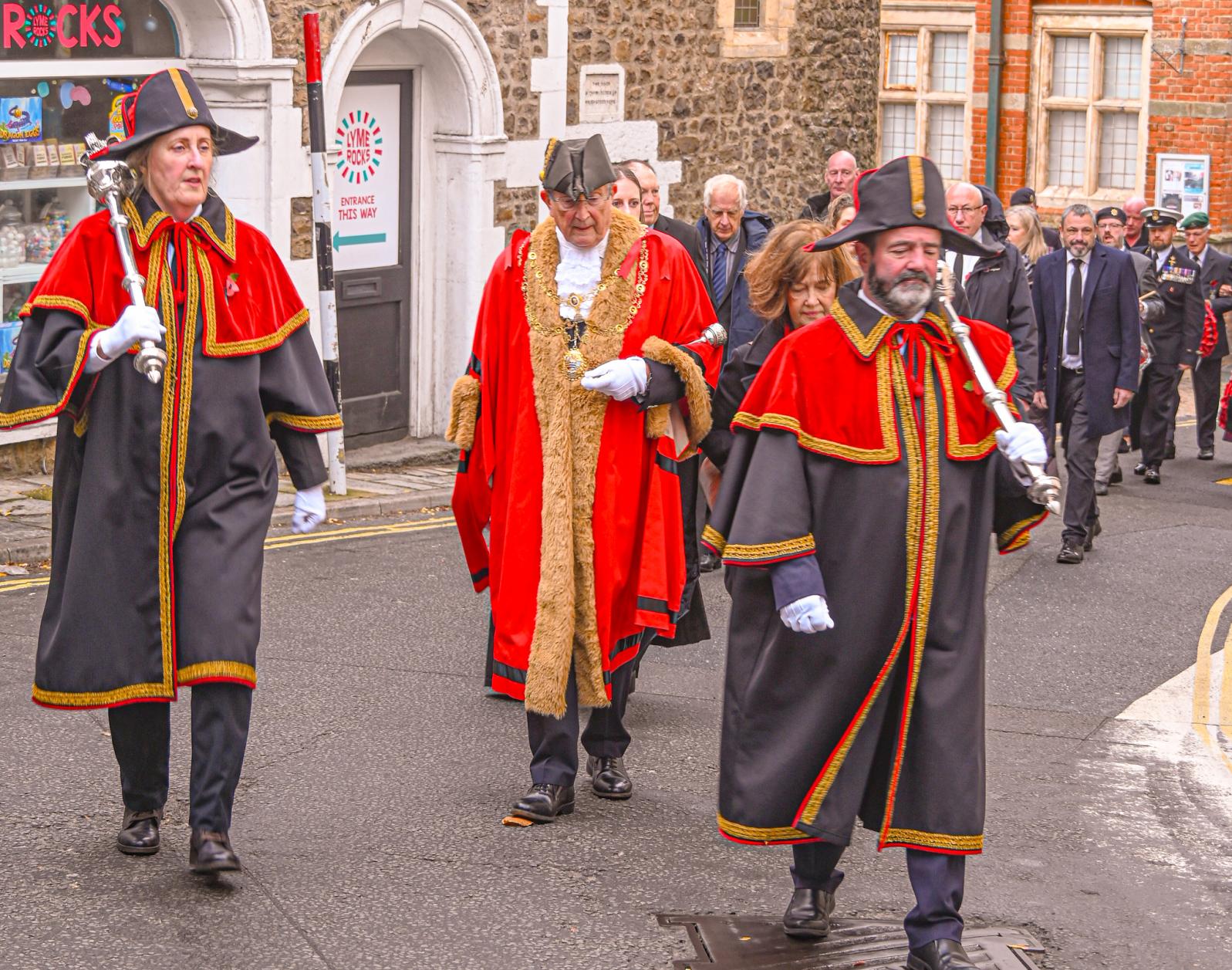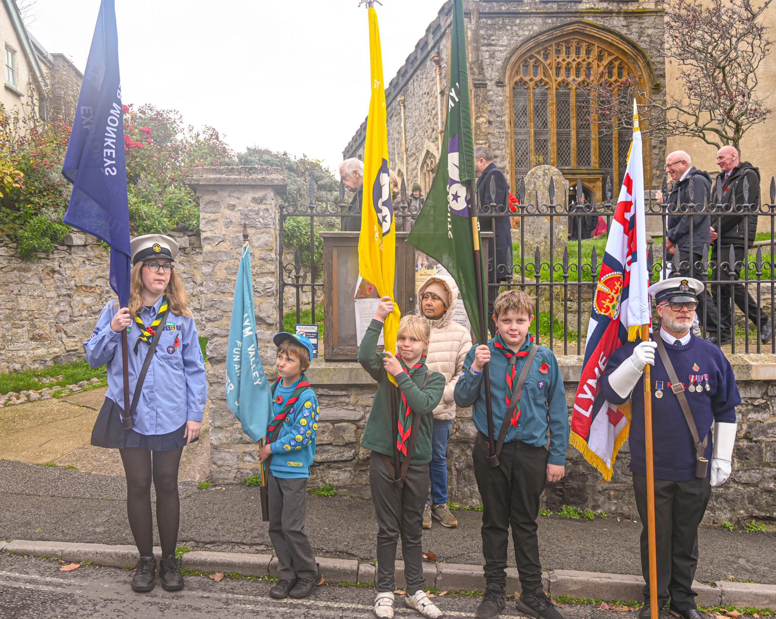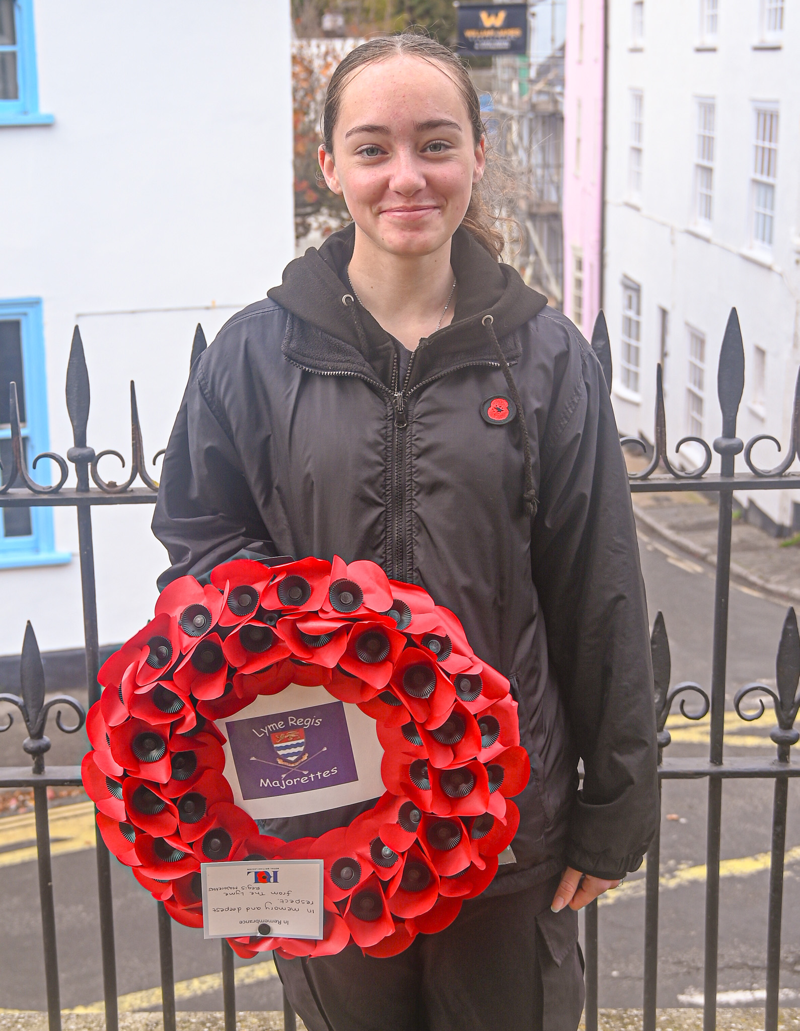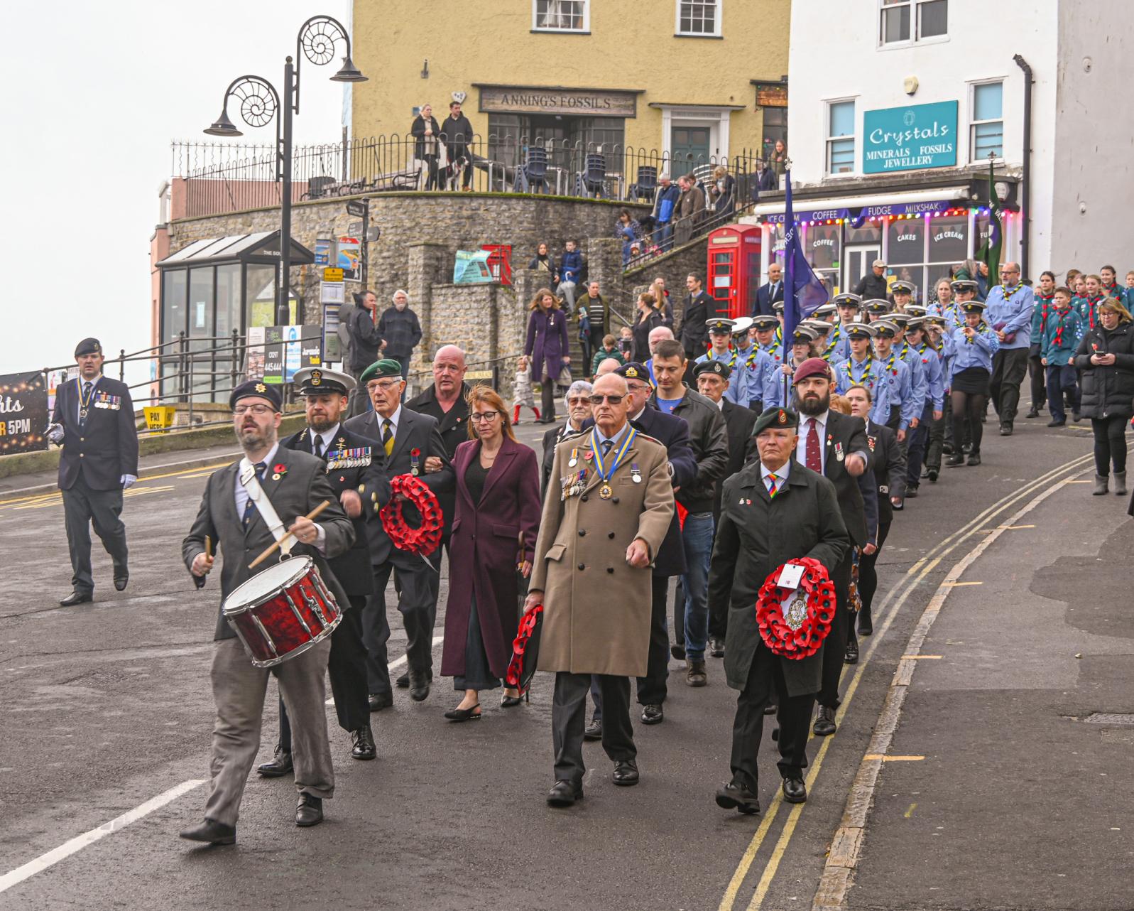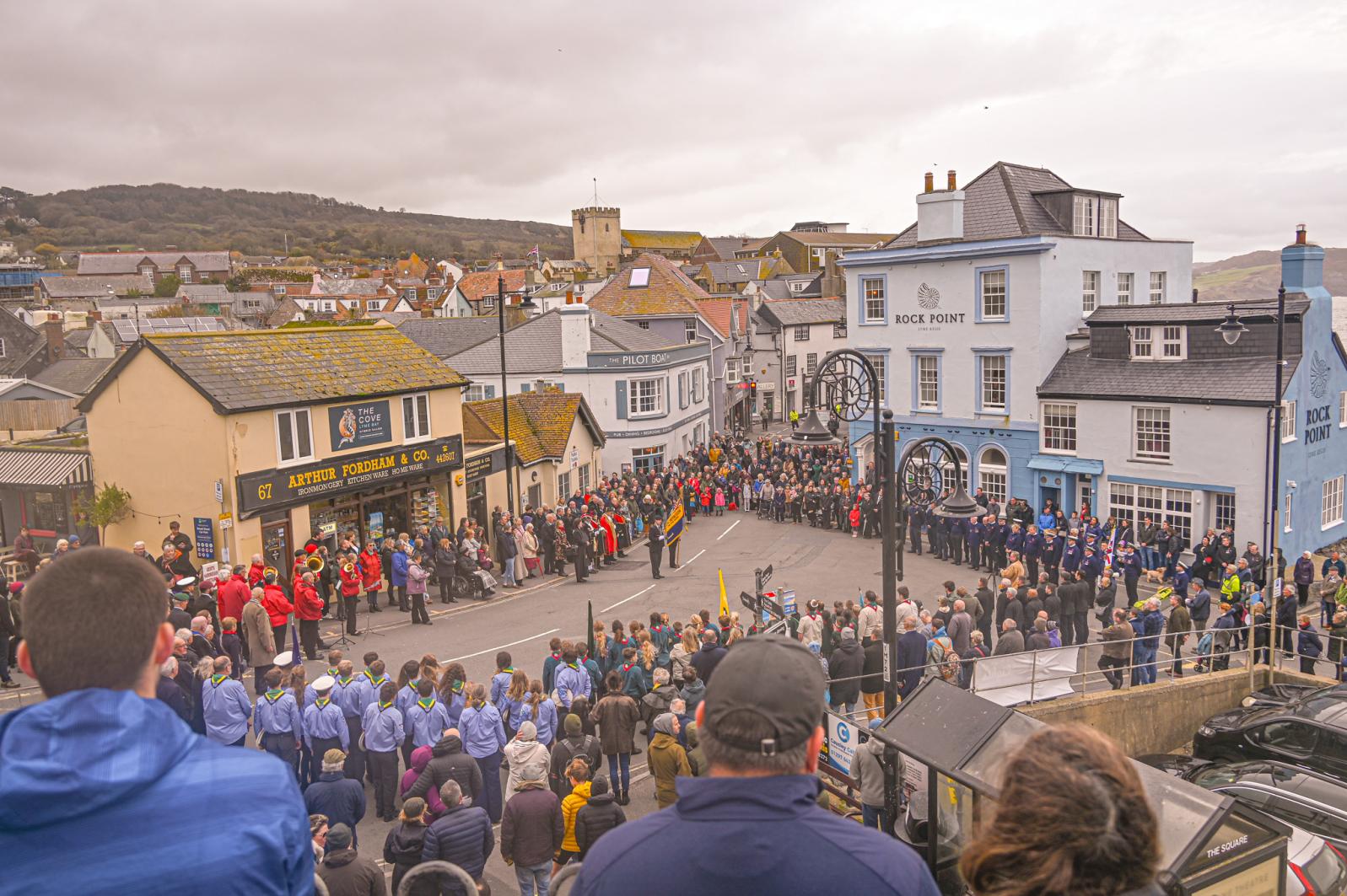 A parade involving members of the Royal British Legion, veterans, civic party, Lyme Regis RNLI, Lyme Regis Coastguards, Lyme Regis Fire Crew, Rotary Club of Lyme Regis, the Powder Monkeys Explorer Sea Scout Unit, Lyme Regis Majorettes, and Lyme Regis Pantomime Society made its way through Broad Street, Bridge Street, and Church Street towards St Michael’s Parish Church, where a special service of remembrance was held.
