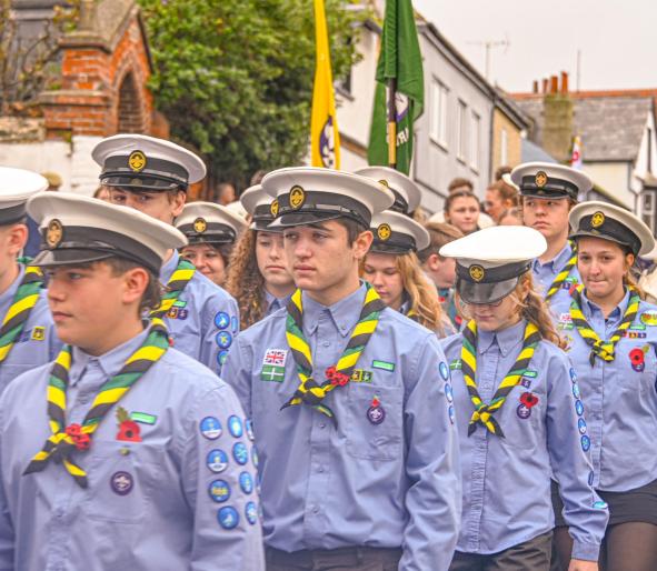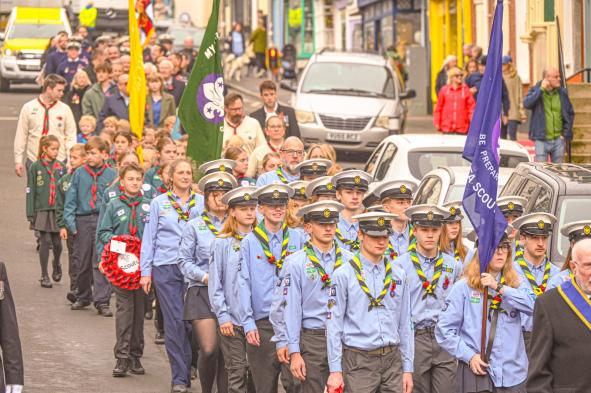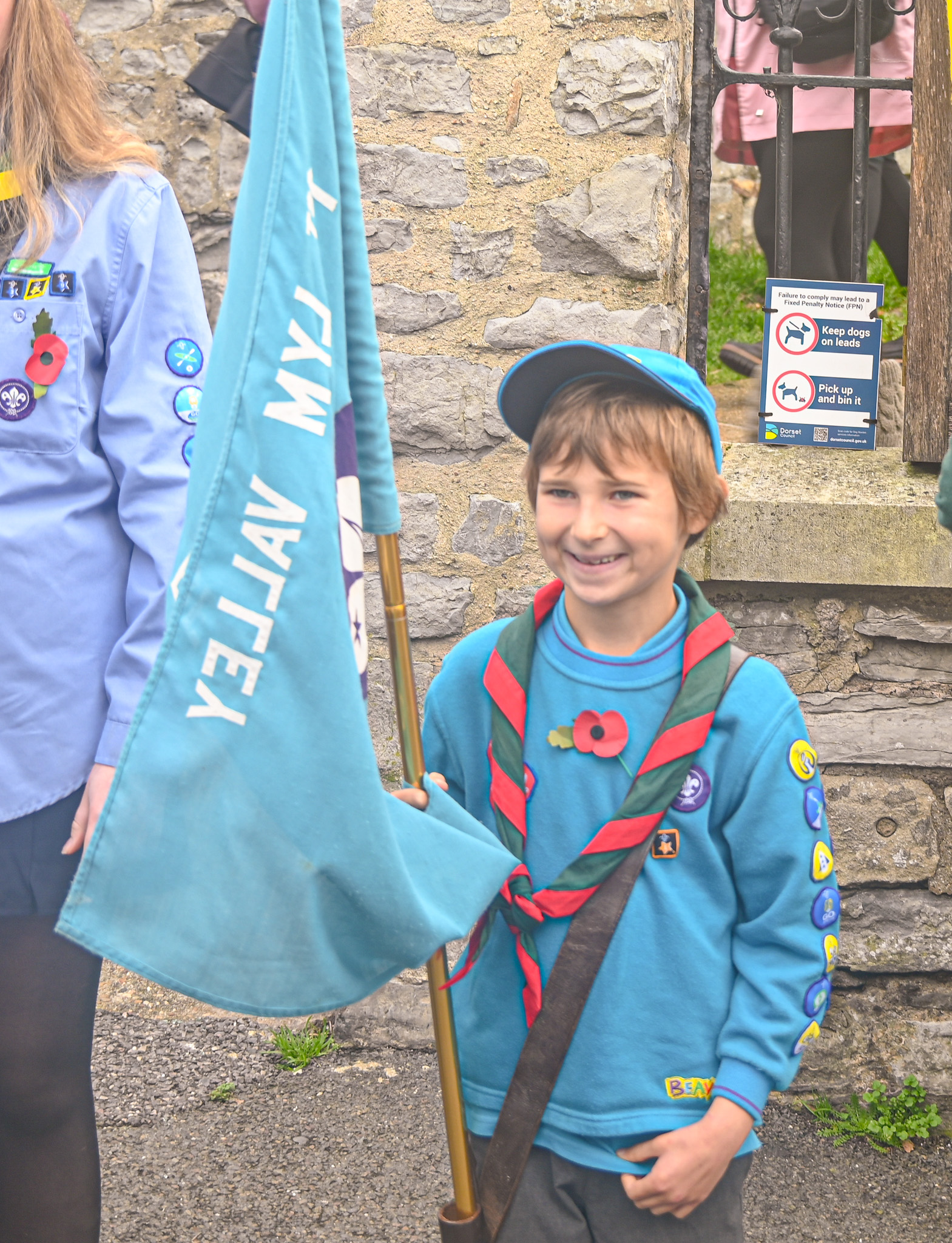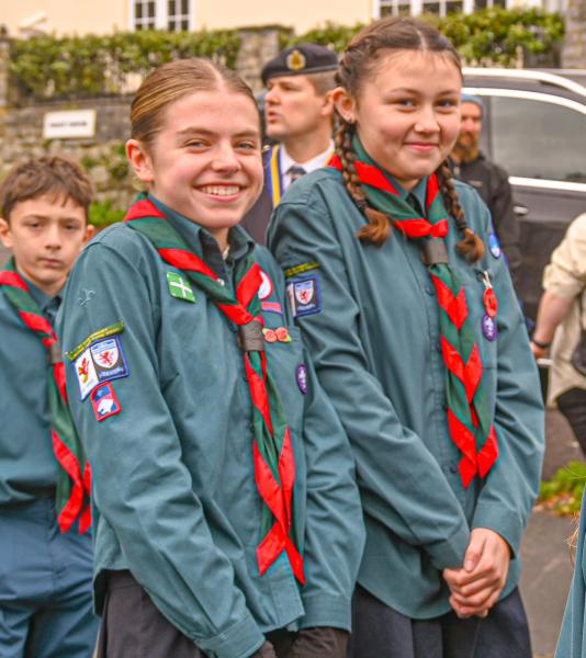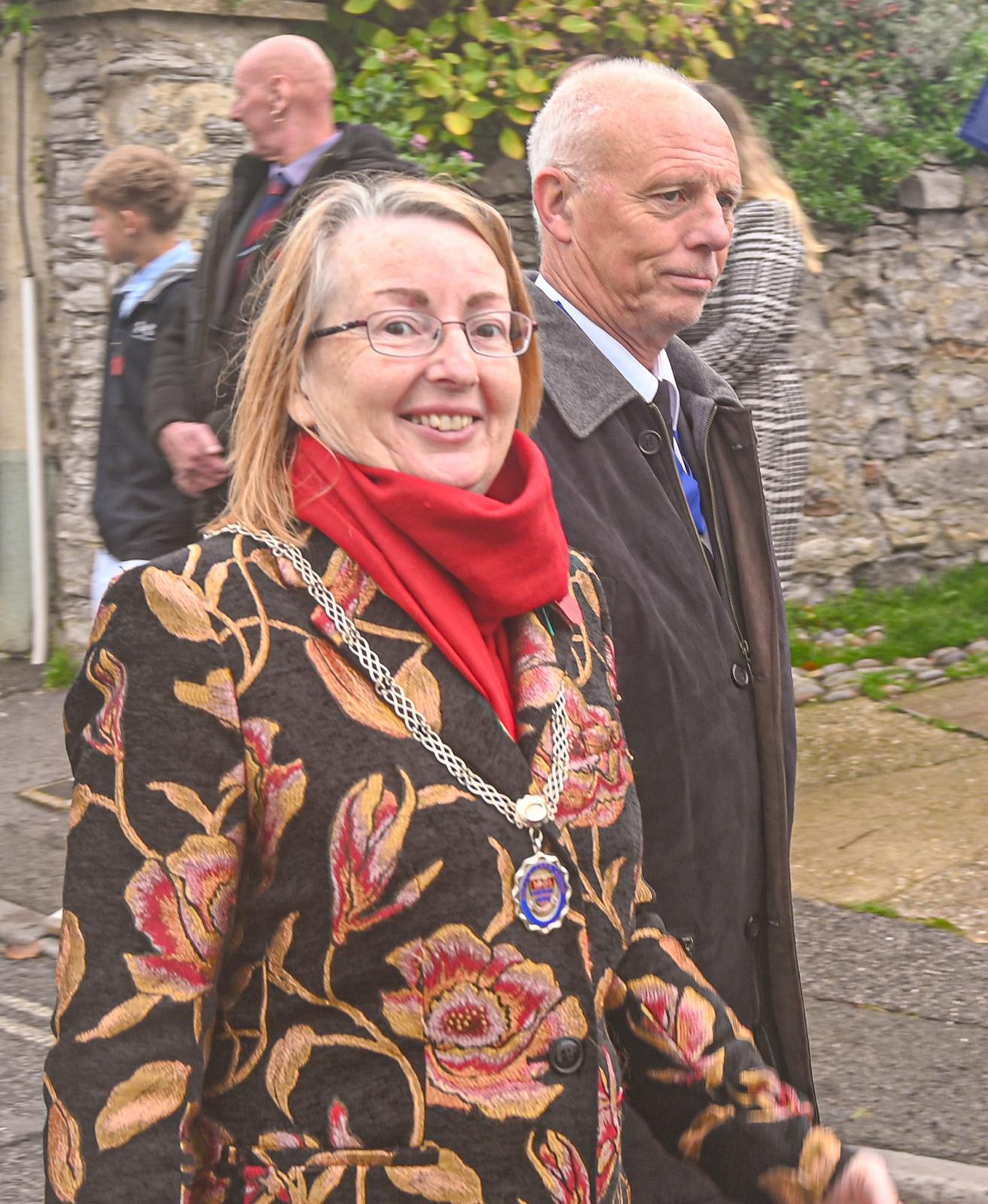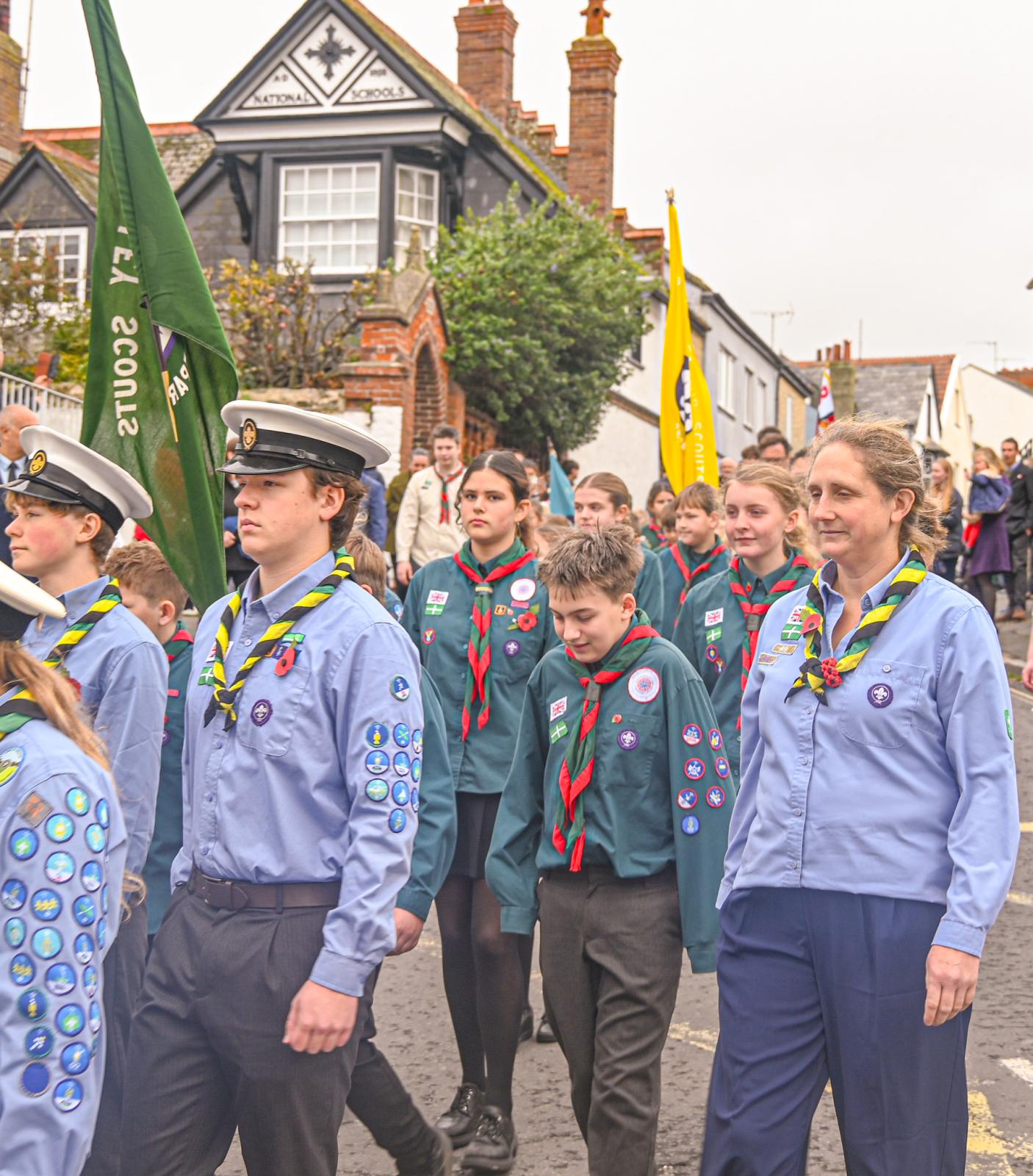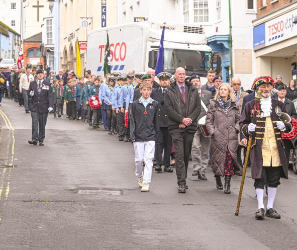 A parade involving members of the Royal British Legion, veterans, civic party, Lyme Regis RNLI, Lyme Regis Coastguards, Lyme Regis Fire Crew, Rotary Club of Lyme Regis, the Powder Monkeys Explorer Sea Scout Unit, Lyme Regis Majorettes, and Lyme Regis Pantomime Society made its way through Broad Street, Bridge Street, and Church Street towards St Michael’s Parish Church, where a special service of remembrance was held.