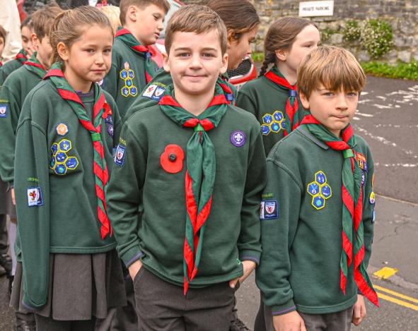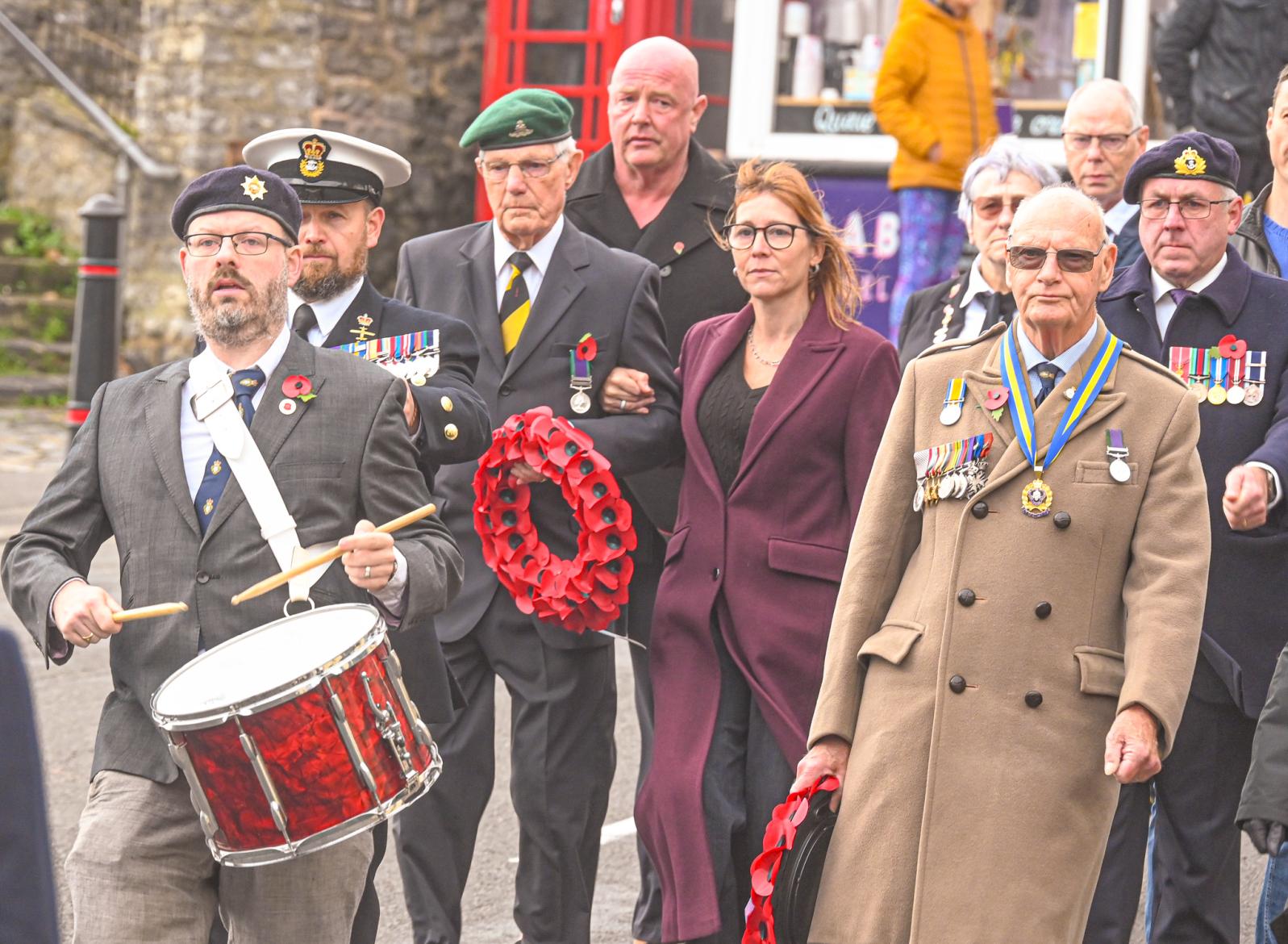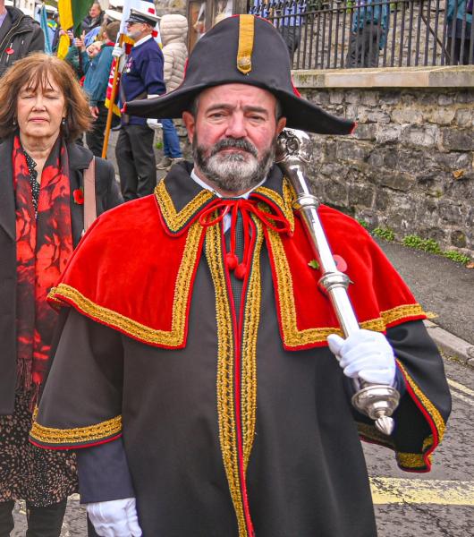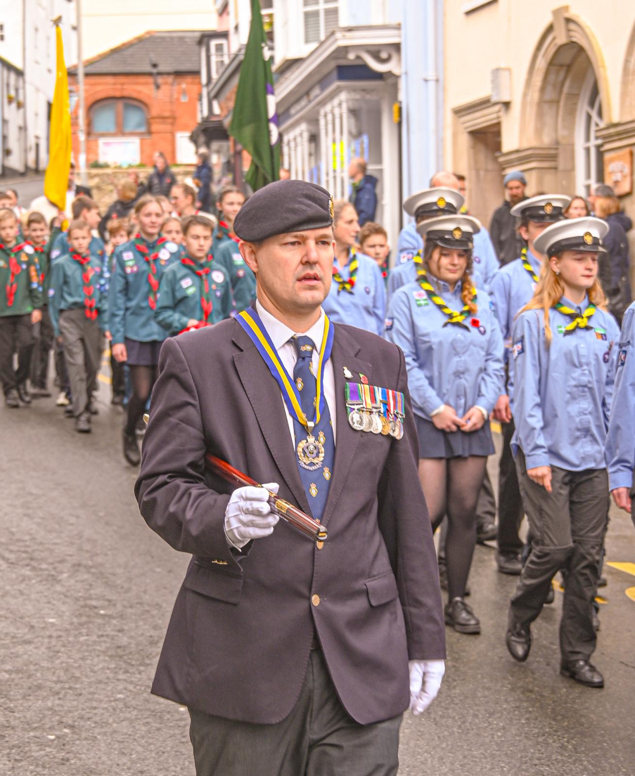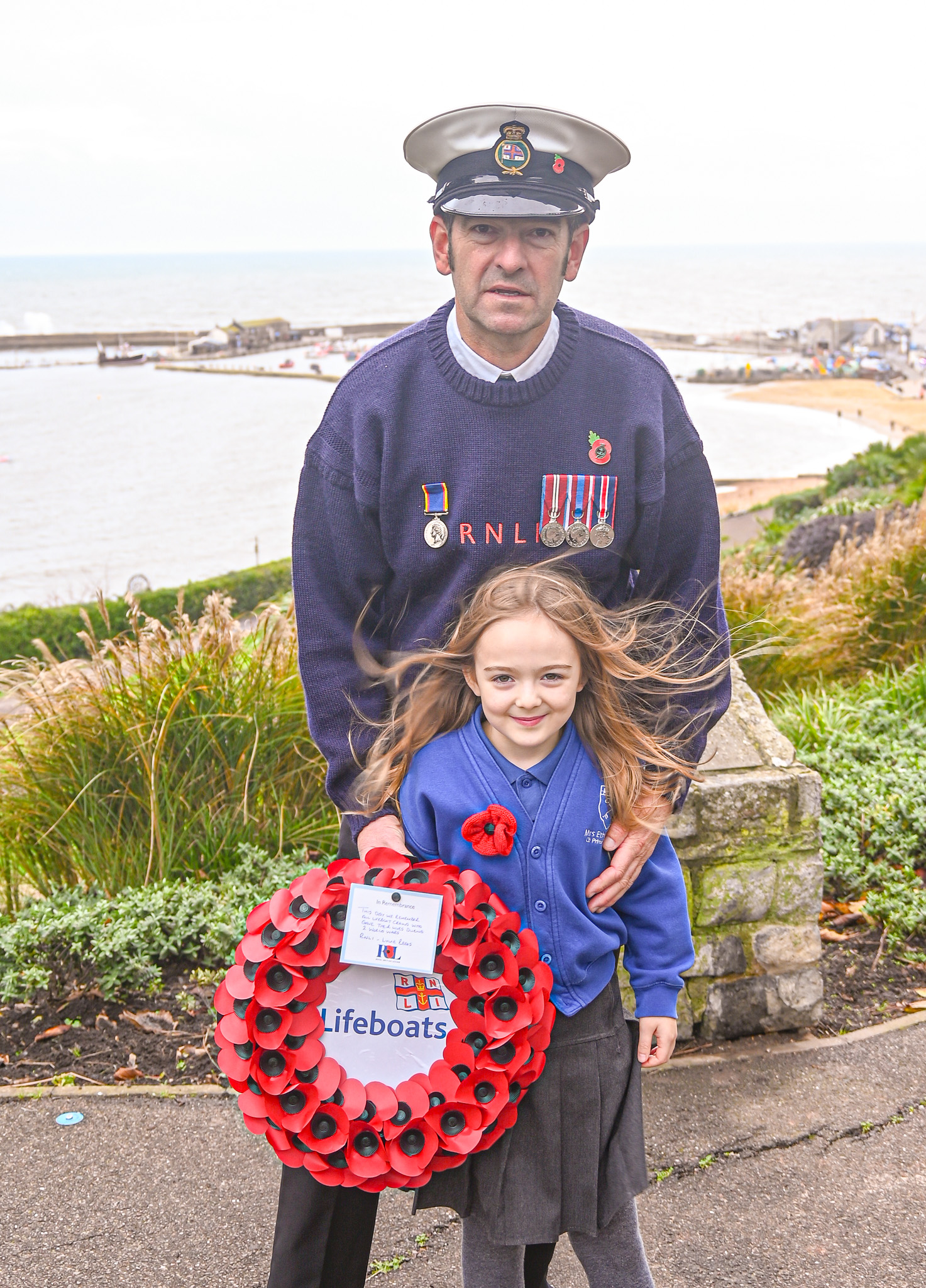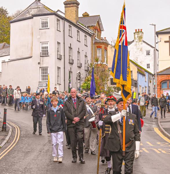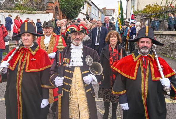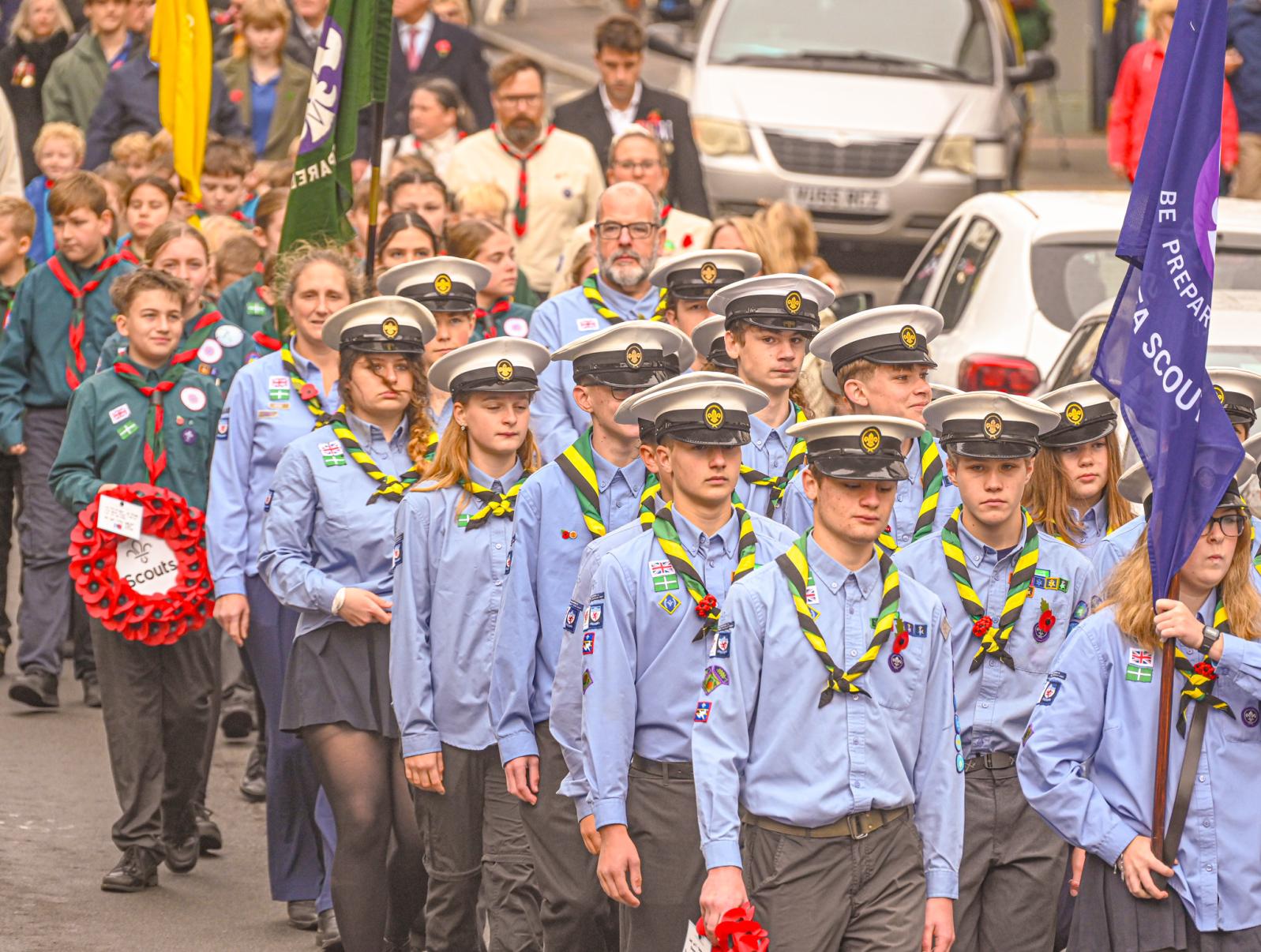 A parade involving members of the Royal British Legion, veterans, civic party, Lyme Regis RNLI, Lyme Regis Coastguards, Lyme Regis Fire Crew, Rotary Club of Lyme Regis, the Powder Monkeys Explorer Sea Scout Unit, Lyme Regis Majorettes, and Lyme Regis Pantomime Society made its way through Broad Street, Bridge Street, and Church Street towards St Michael’s Parish Church, where a special service of remembrance was held.